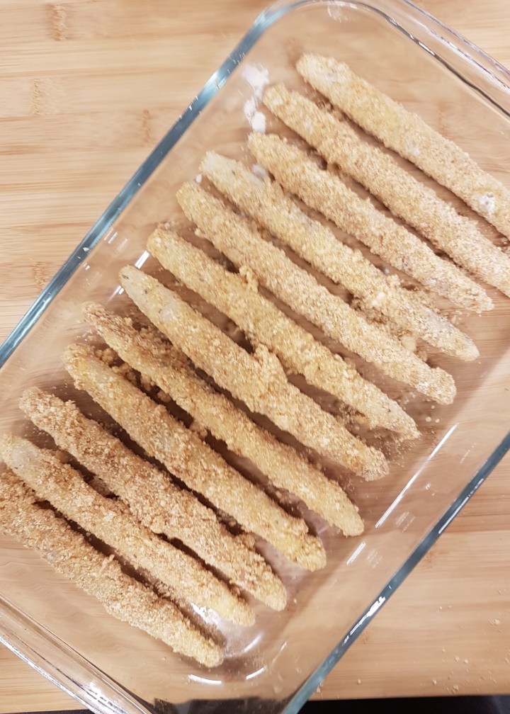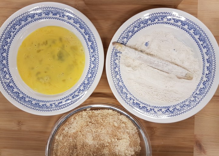 - Répéter cette étape pour toutes les asperges : les recouvrir de farine, les plonger dans l’œuf et enfin les rouler dans le mélange de chapelure et de parmesan.