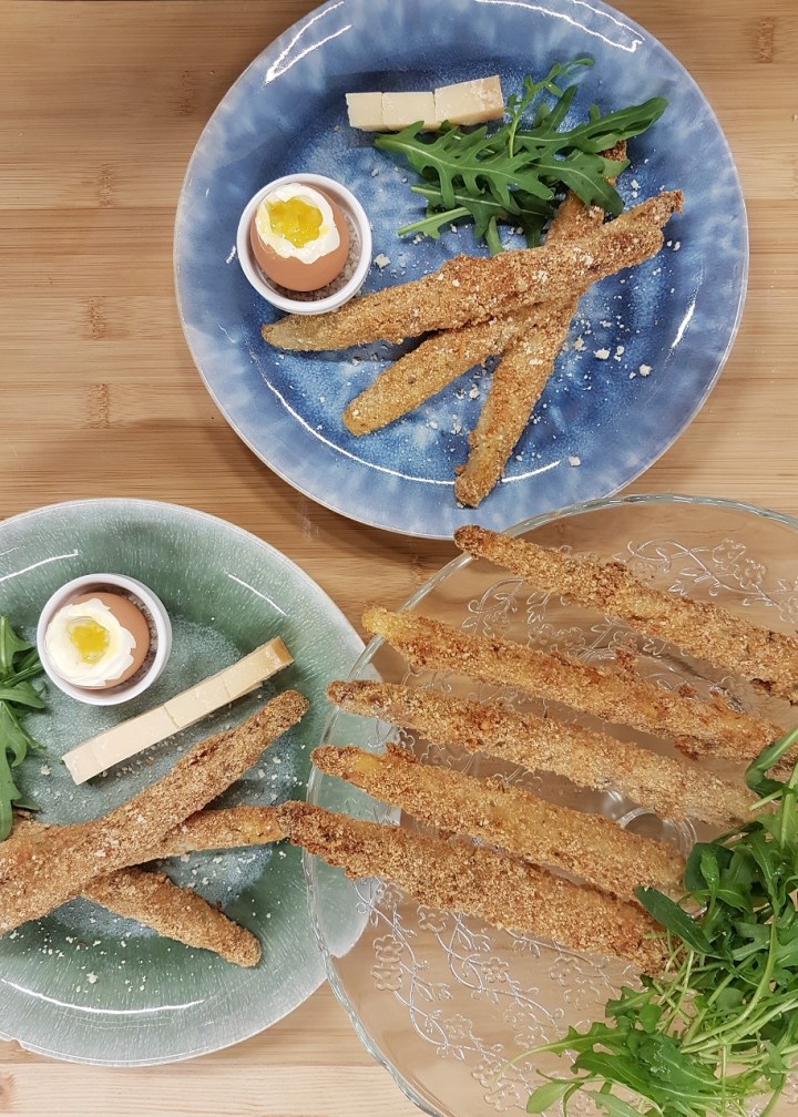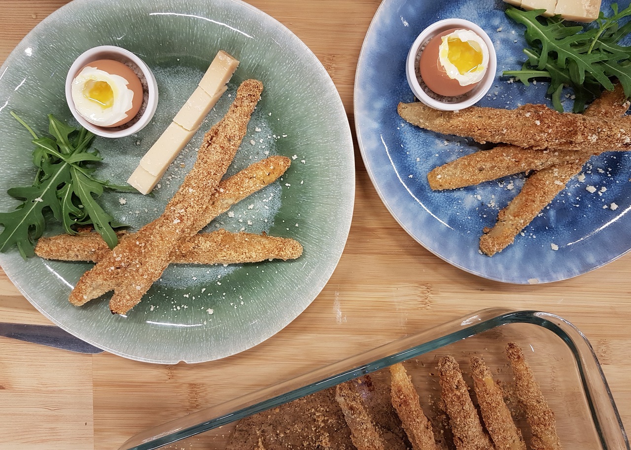 Asperges panées au parmesan et œufs à la coque