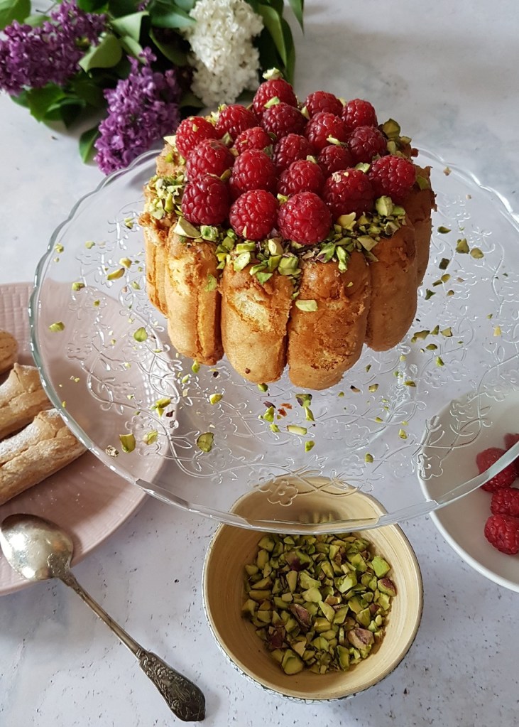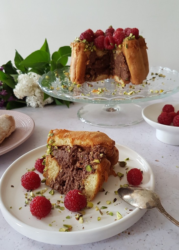 Charlotte soyeuse au chocolat, aux framboises et aux pistaches
