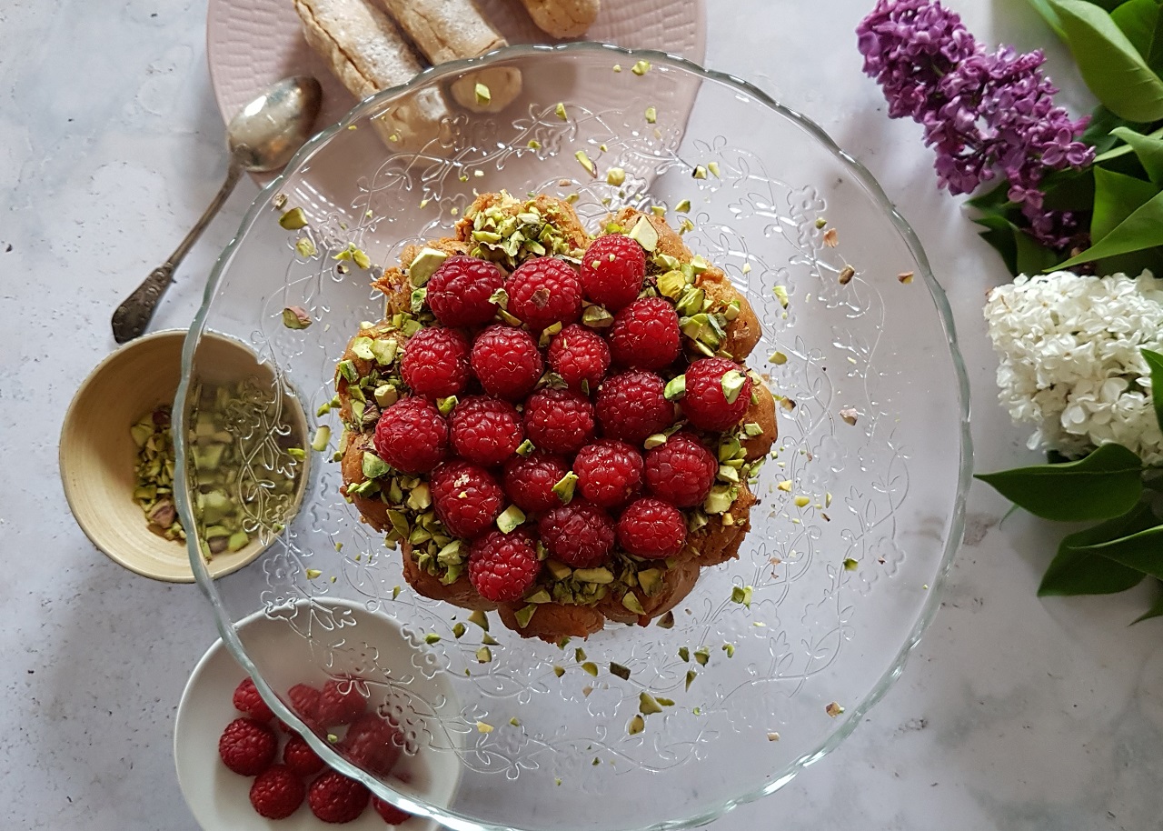- Au moment de servir, décorer avec le reste des pistaches concassées et les framboises fraîches !