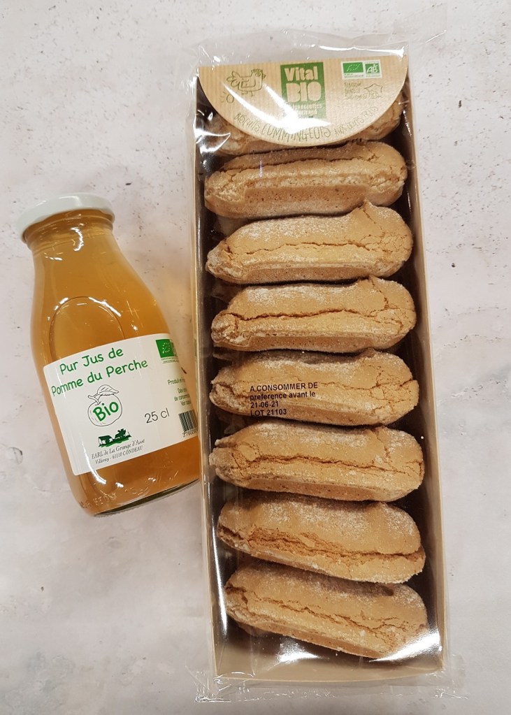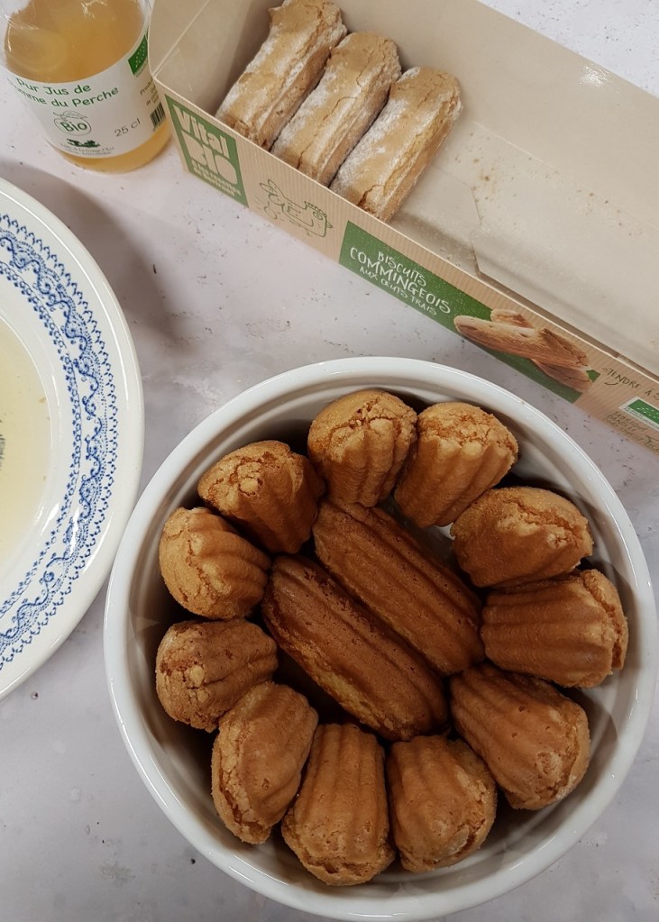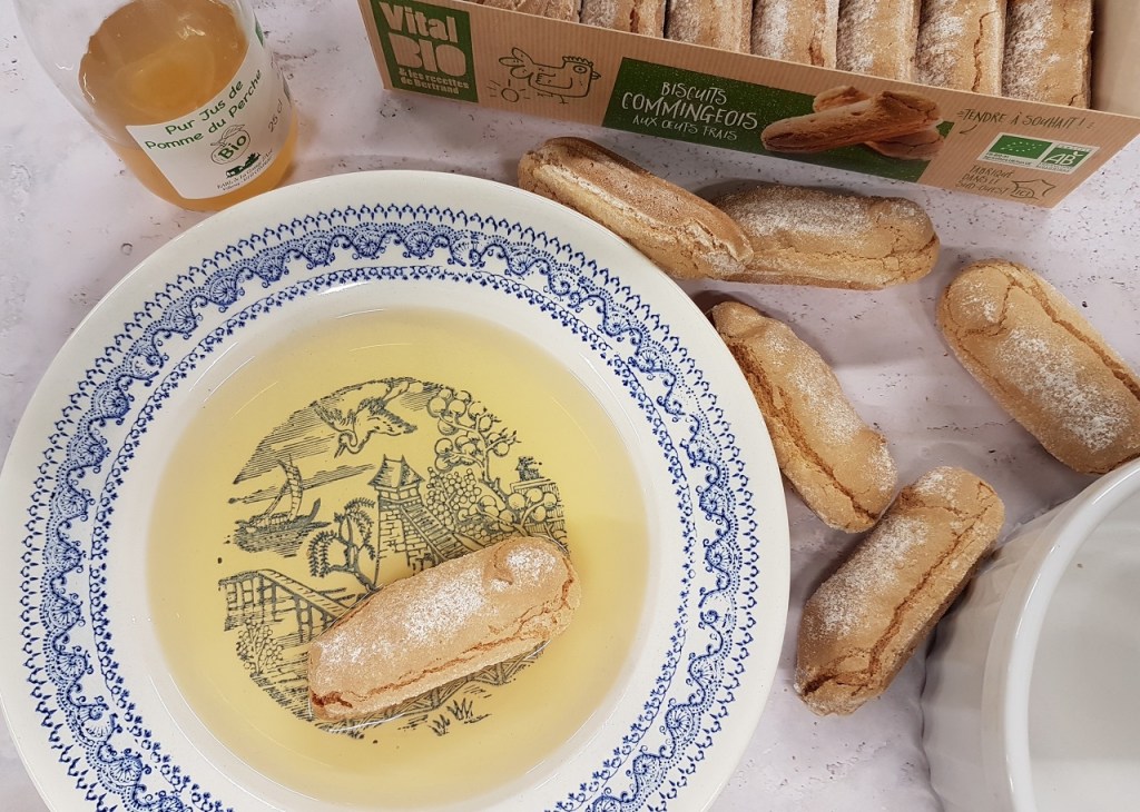 - Tremper les biscuits dans le jus de pomme et tapisser le fond et les cotés d’un moule à charlotte.