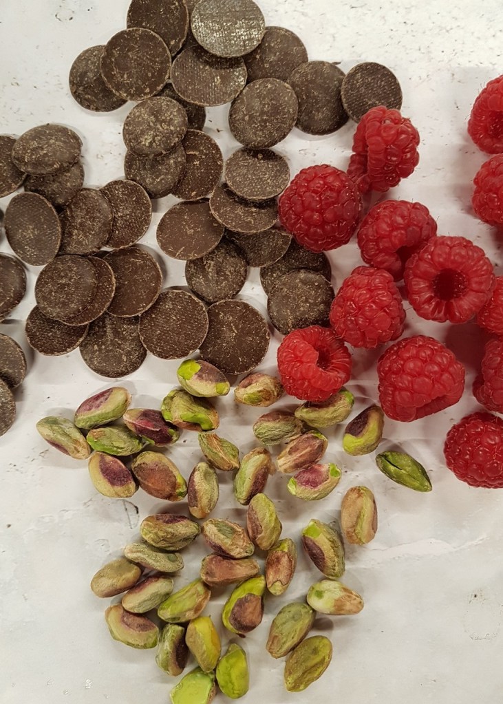Et pour apporter du croquant et de la couleur à cette charlotte aux framboises, j’incorpore des pistaches concassées dans ma crème au chocolat !