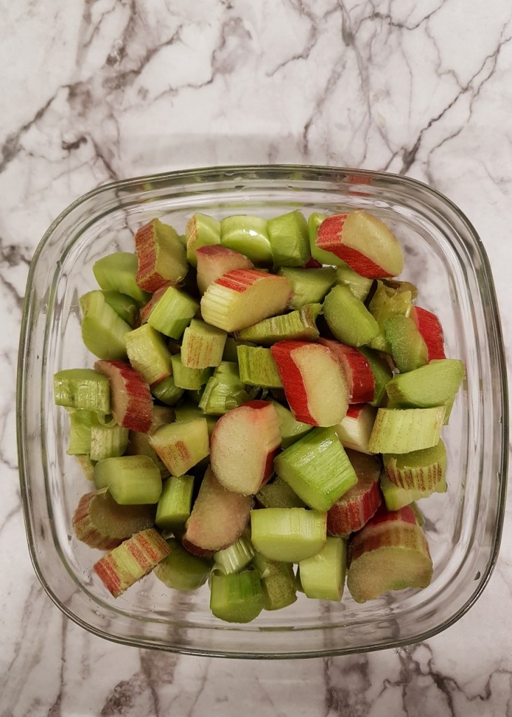 - Mettre la rhubarbe dans une boite de conservation avec le sucre de canne et placer au frais pendant la nuit.