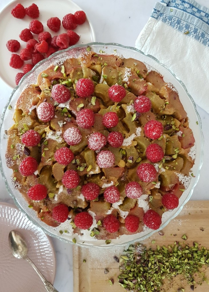 - Lorsqu’il a refroidi, le saupoudrer de sucre glace, le parsemer de pistaches concassées et disposer harmonieusement les framboises !