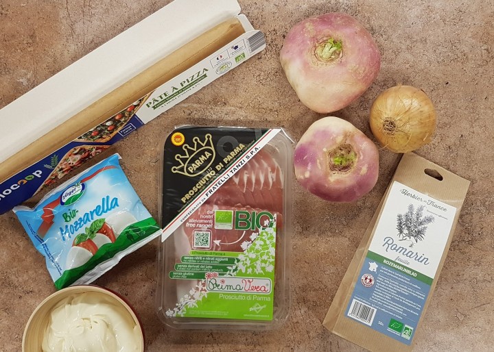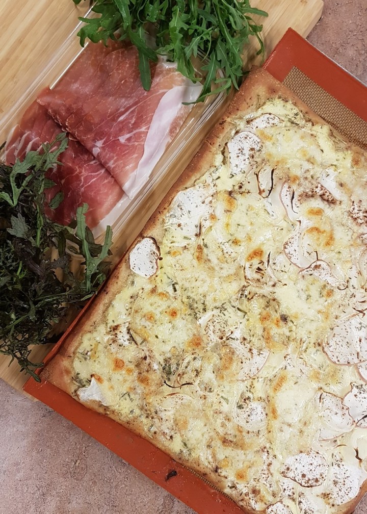 Pizza printanière aux navets, au jambon de Parme et à la mozzarella