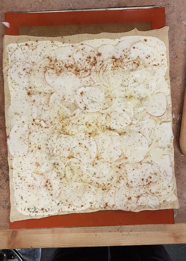 - Dérouler la pâte à pizza et la recouvrir de crème au romarin.