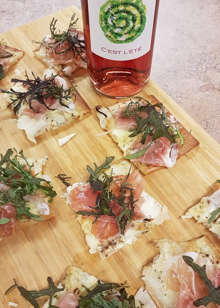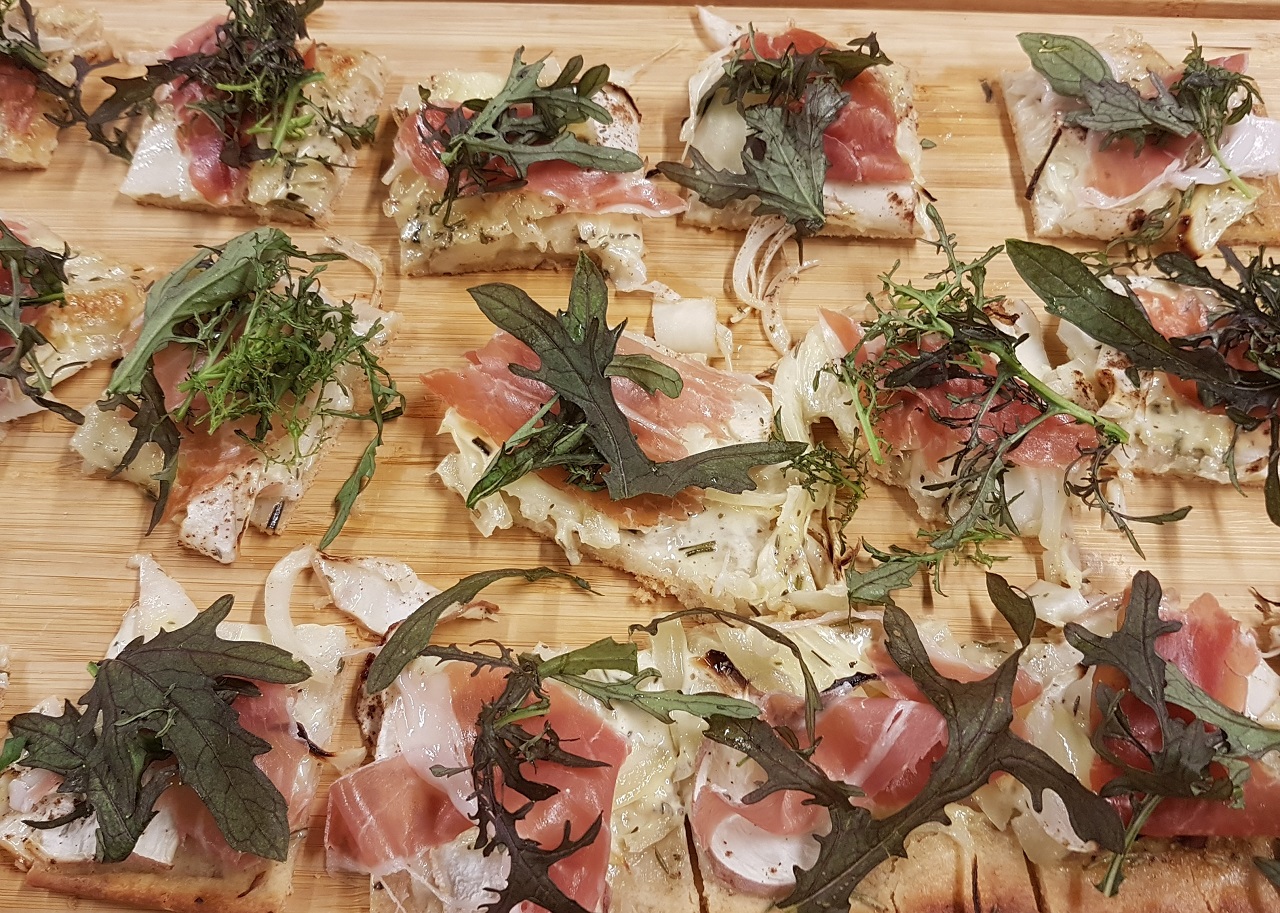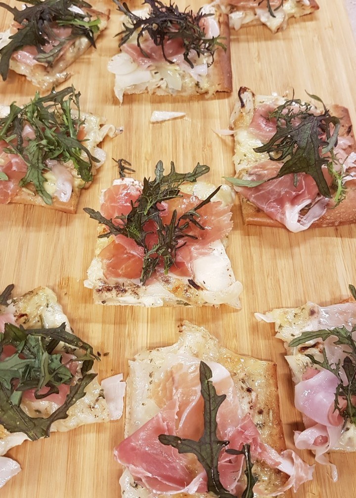 - À la sortie du four, couper la pizza en petits carrés de 3 cm sur 3 cm, ajouter la chiffonnade de jambon de Parme et les feuilles de roquette ou de moutarde japonaise mizuna. Servir avec un rosé bien frais !