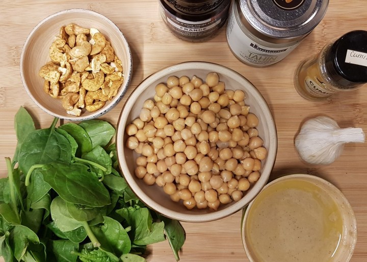 - Dans un blender, mixer ensemble les pois chiches égouttés, le tahin, le jus et le zeste de citron, l’ail pressé, l’huile d’olive et les jeunes pousses d’épinards.