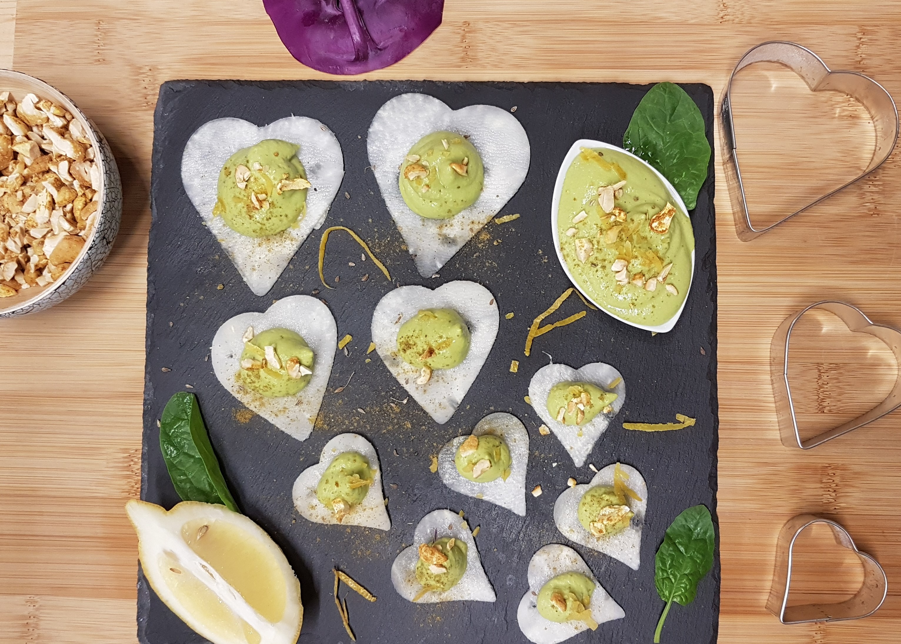 L’ajout du zeste de citron apporte vivacité et légèreté à cette recette et j’ai choisi de mixer les jeunes pousses d’épinards crues, car les cuire nous priverait de leurs précieux nutriments. J’ajoute souvent un « topping » à mon houmous pour lui apporter du croquant : la noix de cajou au curry concassée joue pleinement son rôle !