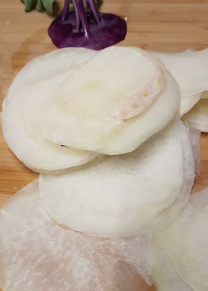 Vous pouvez choisir de conserver ou d’éplucher sa peau très fine. Le chou rave peut être cuit à la vapeur 5 à 7 minutes, exactement comme le pied du brocoli, mais c’est cru que je le préfère car sa texture est croquante et juteuse et sa saveur de chou est très douce.