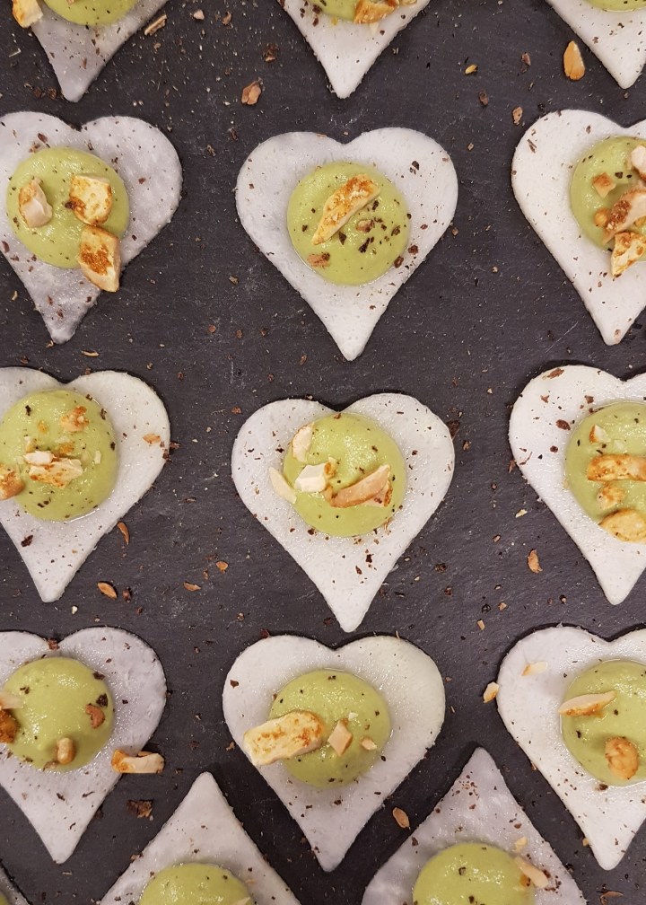 - Déposer du houmous au centre de chaque tranche (à l’aide d’une poche à douille) et parsemer de noix de cajou concassées. Déguster !