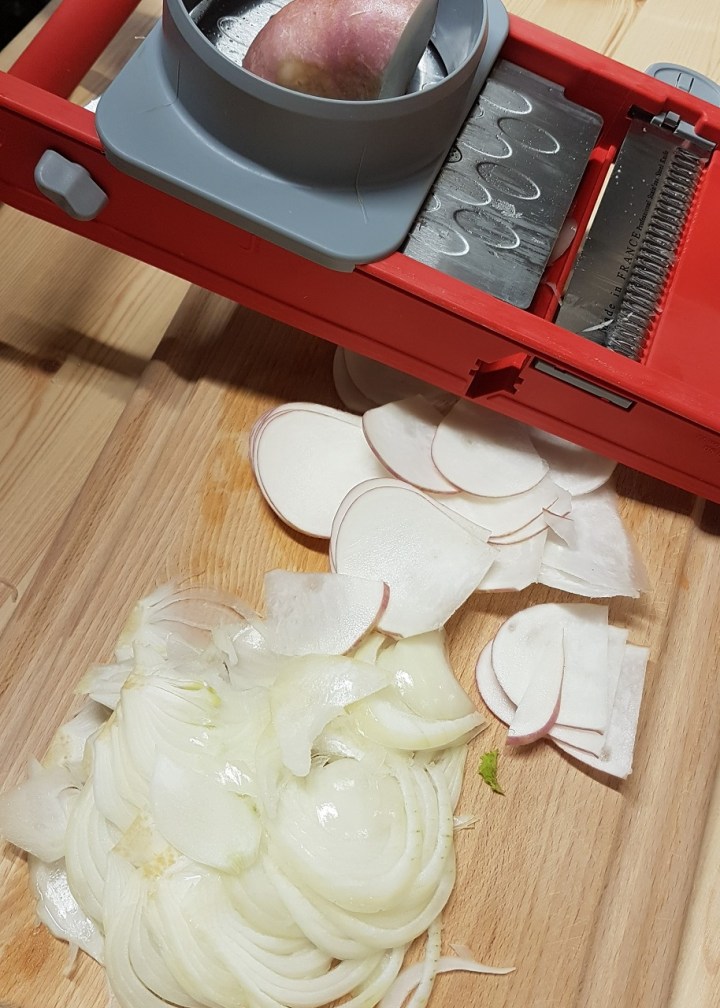 - légumes crus émincés à la mandoline (ici, du chou-rave découpé à l’emporte-pièce) *peut contenir des allergènes