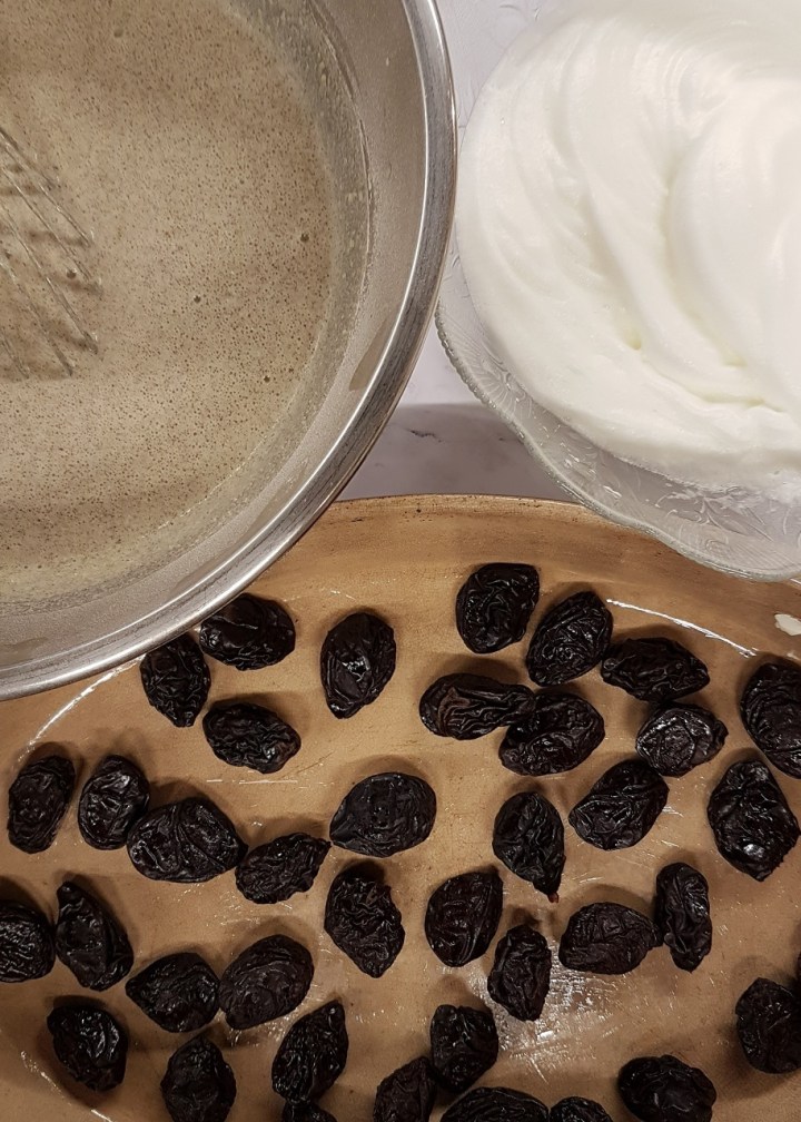 8. Beurrer un plat à four et y disposer les pruneaux, puis recouvrir avec la préparation.