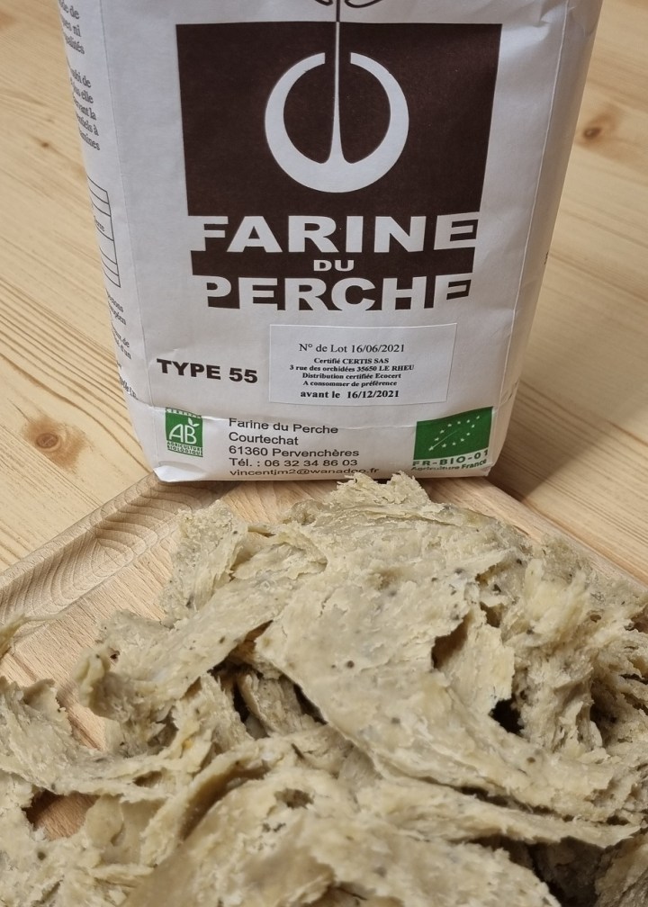 Marc Lecouble fabrique son seitan bio et local dans son atelier au Mans, à partir de la farine bio du Perche (T55) de notre fournisseur de farine bio et local. La farine est mélangée à de l’eau et pétrie, puis lavée pour récupérer la protéine (le gluten).