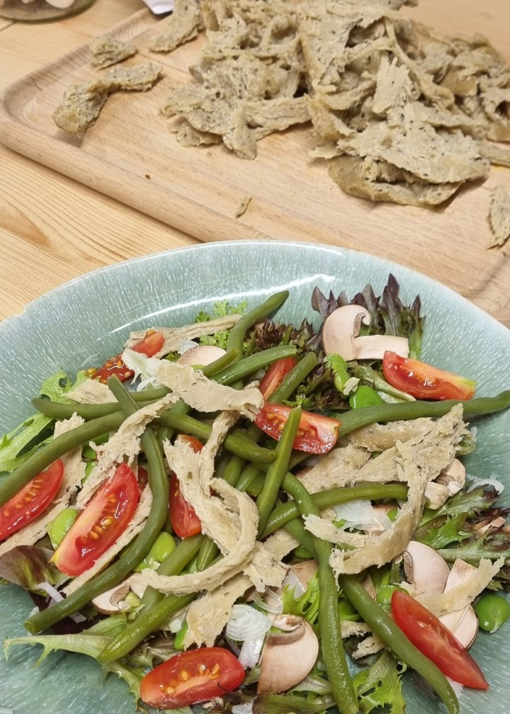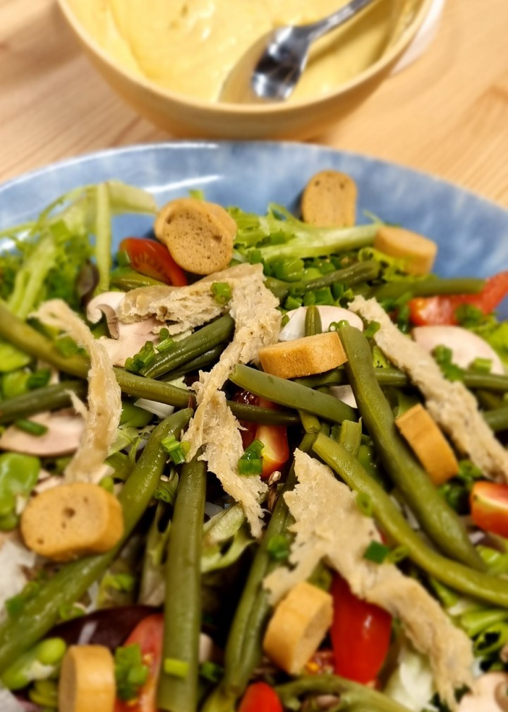 - Ajouter les haricots verts, l’effiloché de seitan nature et les croutons.