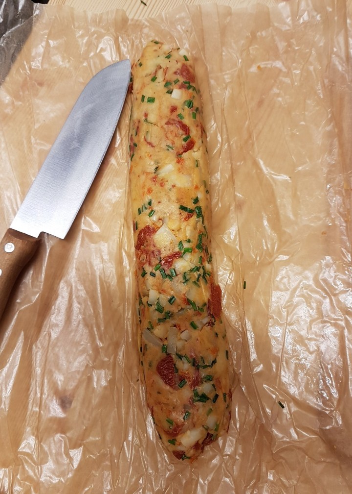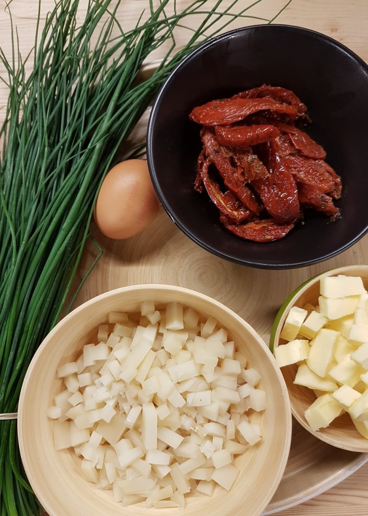 - Incorporer l’œuf, puis le fromage, les tomates séchées et la ciboulette.