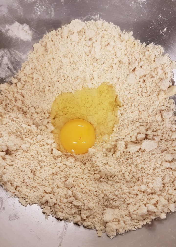 - Dans un cul-de-poule, mélanger la farine et le beurre demi-sel coupé en dés, puis sabler du bout des doigts.