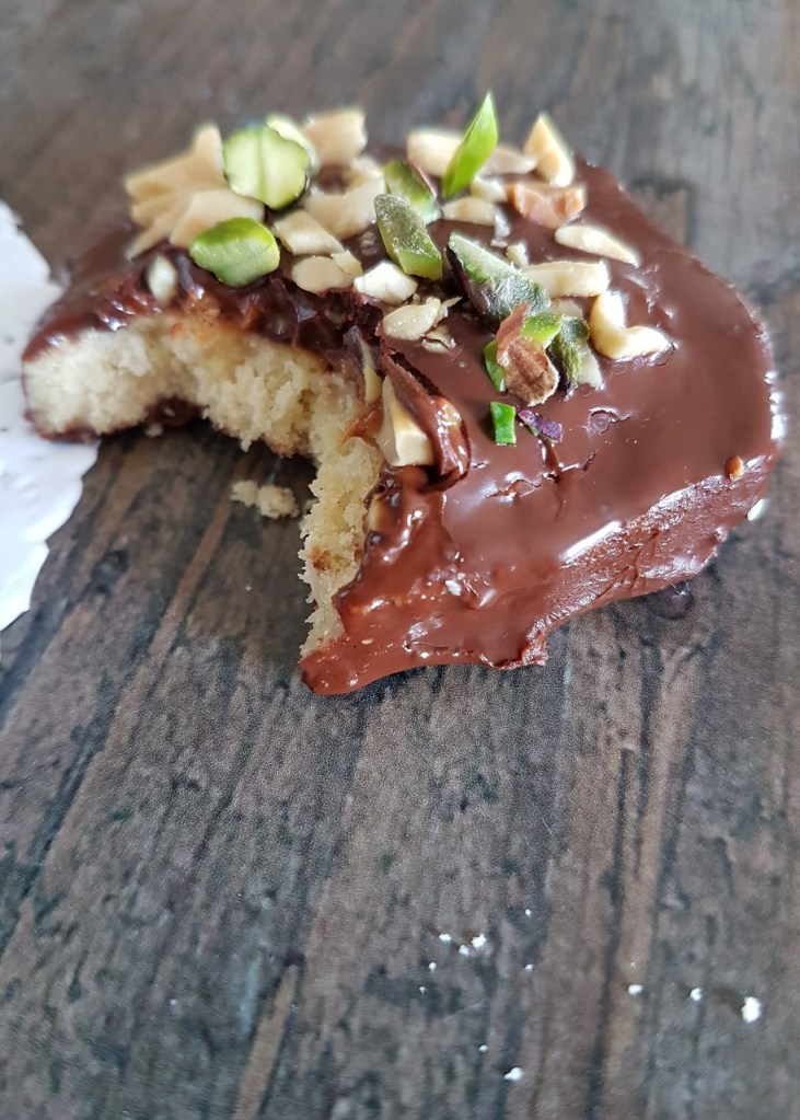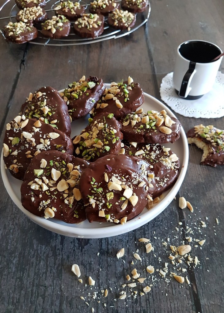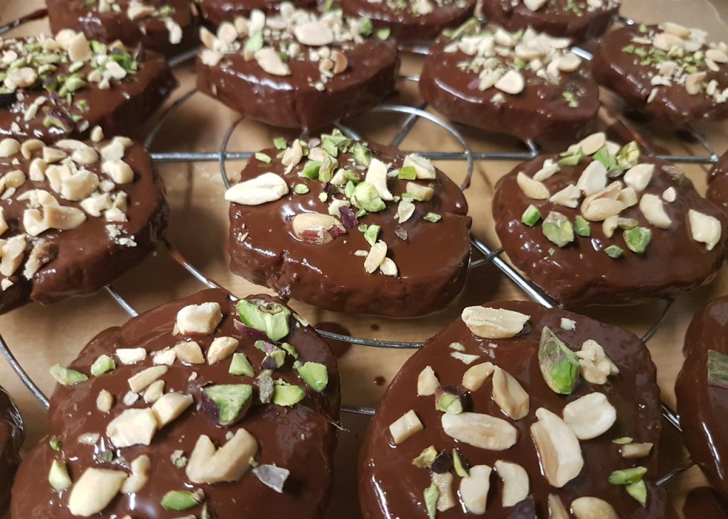 - Tremper chaque biscuit dans le chocolat fondu, puis parsemer de pistaches et de cacahuètes.