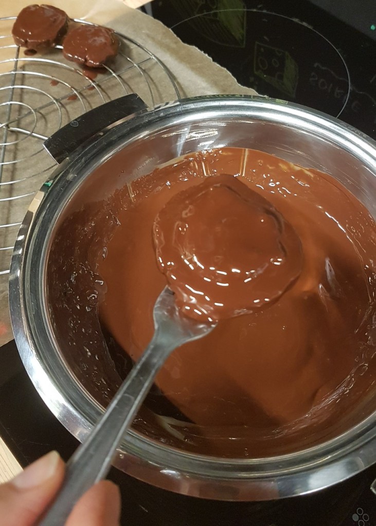 - Pendant ce temps, faire fondre les palets de chocolat au bain-marie avec une cuillère à café d’huile de coco pour rendre le chocolat plus fluide.