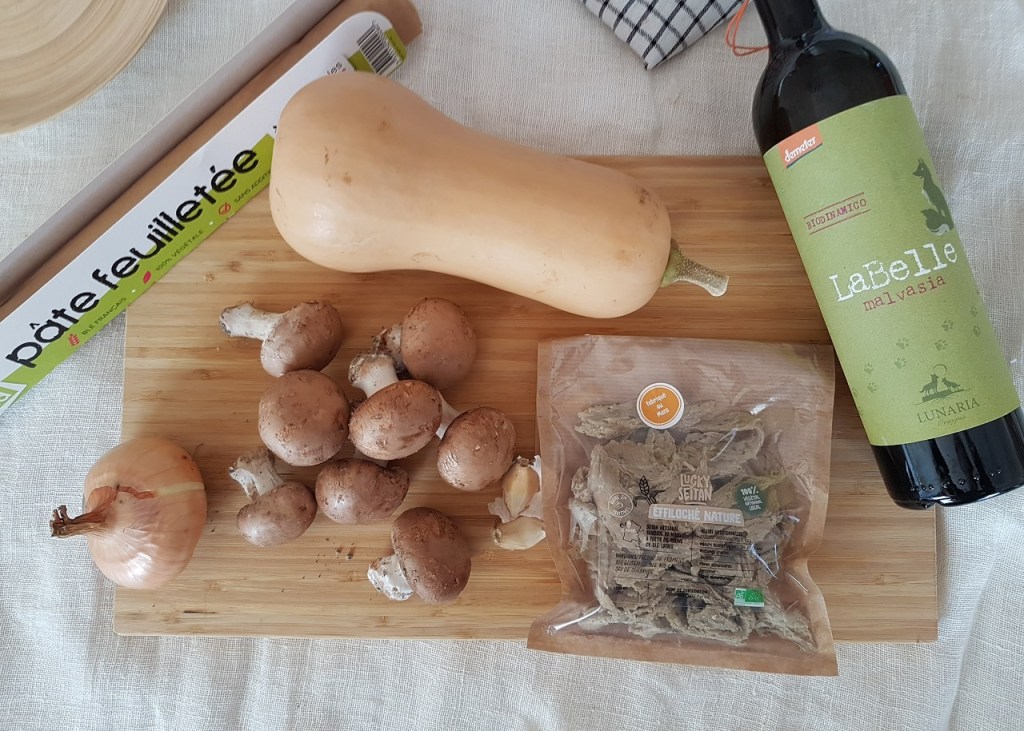 Dans cette recette vegan, pensez à choisir un vin blanc bio et vegan ! Je vous propose un vin blanc sec italien, cépage Malvoisie. Vous l’utiliserez pour déglacer à la fin de la cuisson de la garniture, puis vous le dégusterez avec la tourte !