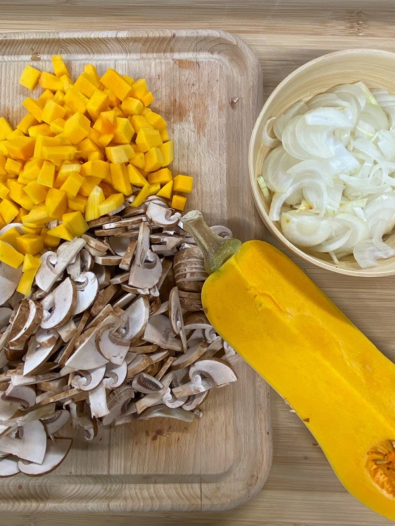 - Émincer les oignons et les champignons, éplucher la courge et la couper en petits cubes.