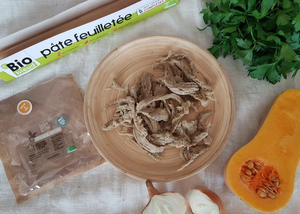 L’occasion s’est présentée quand Marc Lecouble, producteur du merveilleux seitan Lucky Seitan, m’a sollicitée pour la création d’une recette automnale avec son effiloché de seitan nature. Je lui ai proposé de créer une succulente tourte au seitan vegan, au fondant incomparable grâce à la courge butternut !