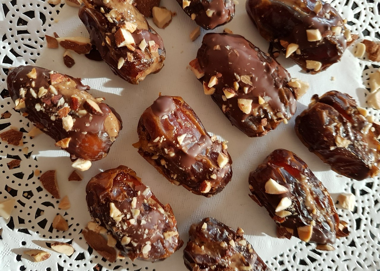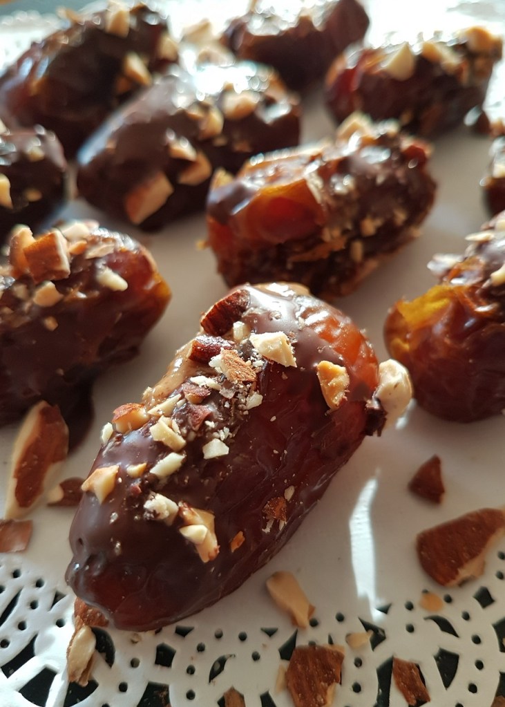 Dattes fourrées à la purée d'amande nappées de chocolat noir