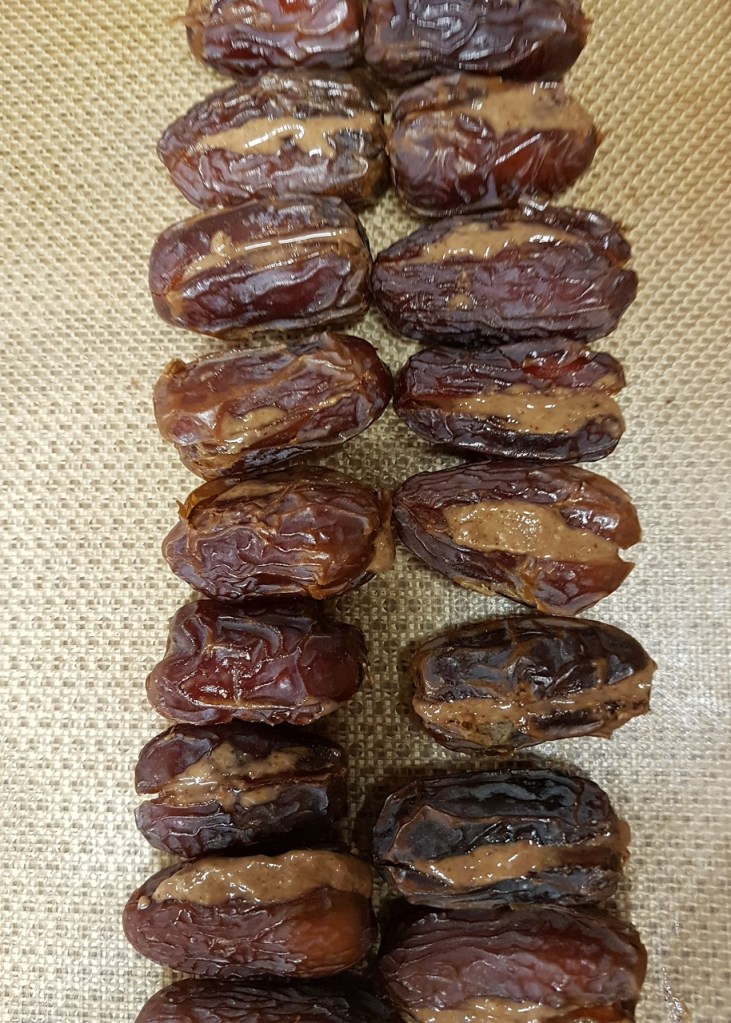 - Garnir chaque datte d’une cuillère à café de purée d’amande complète.
