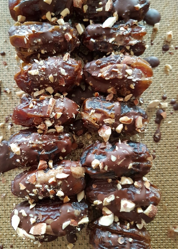 - Déposer les dattes sur une plaque et les napper de chocolat fondu en filet.
