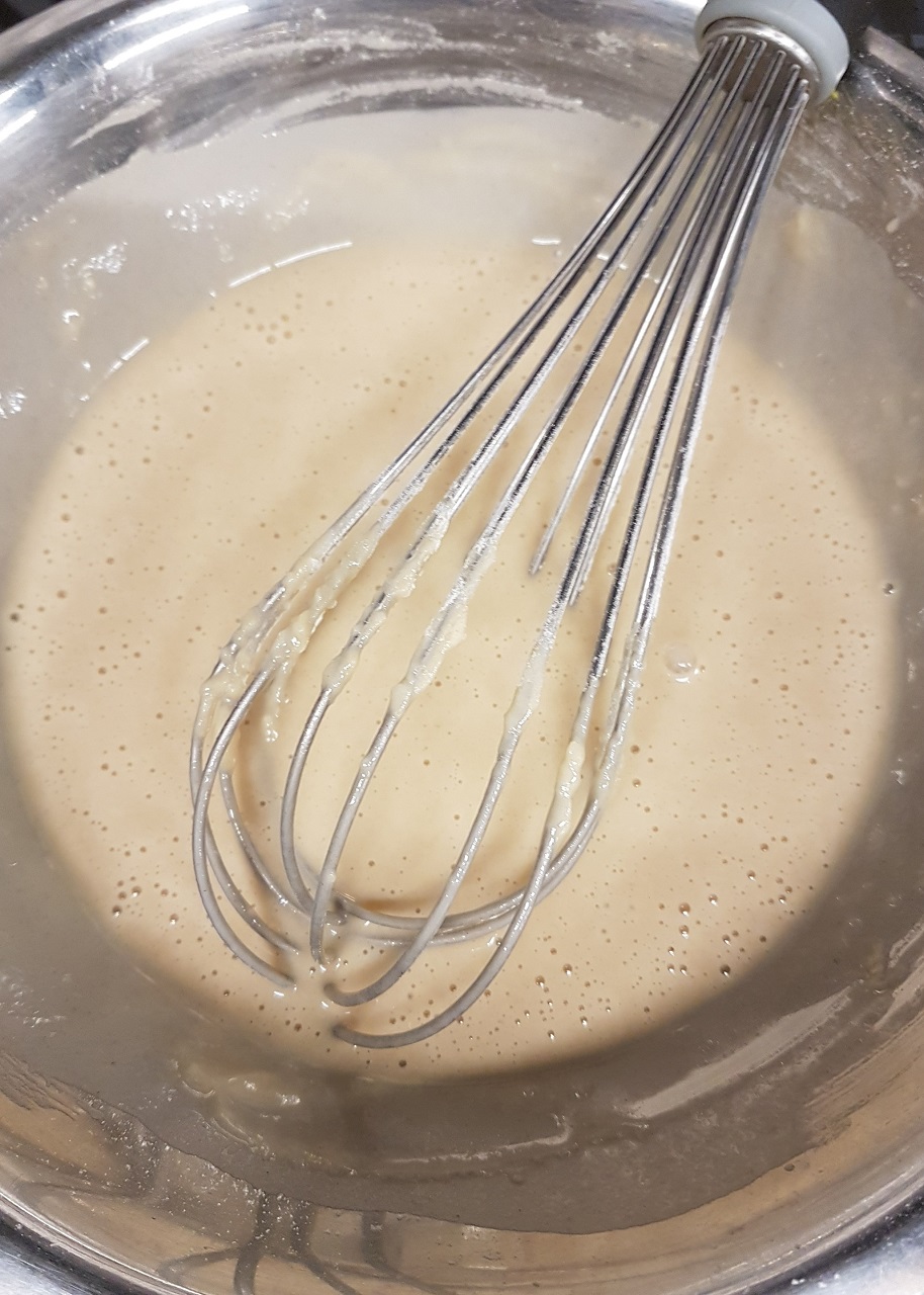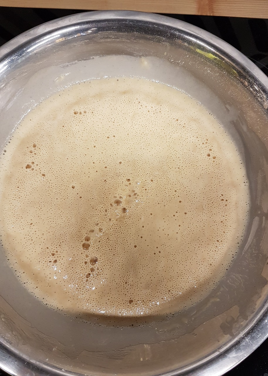 - Ajouter 75 g de sucre de canne et 150 g de farine, puis mélanger pour obtenir une pâte à crêpe épaisse. Couvrir et laisser reposer 15 minutes, le temps que la préparation gonfle et fasse des bulles.