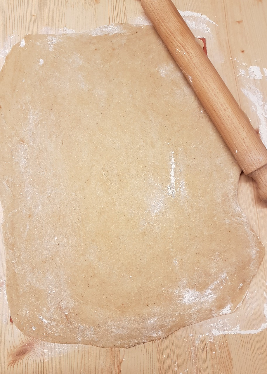 - Dégazer la pâte sur le plan de travail légèrement fariné, puis l’abaisser au rouleau à pâtisserie en un grand rectangle de 30 x 40 cm.
