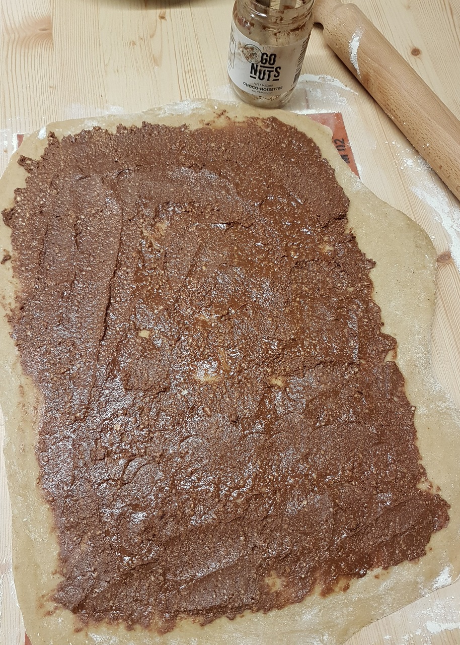 - Répartir la pâte à tartiner choco-noisettes sur la pâte en laissant les bords libres sur 2 cm.