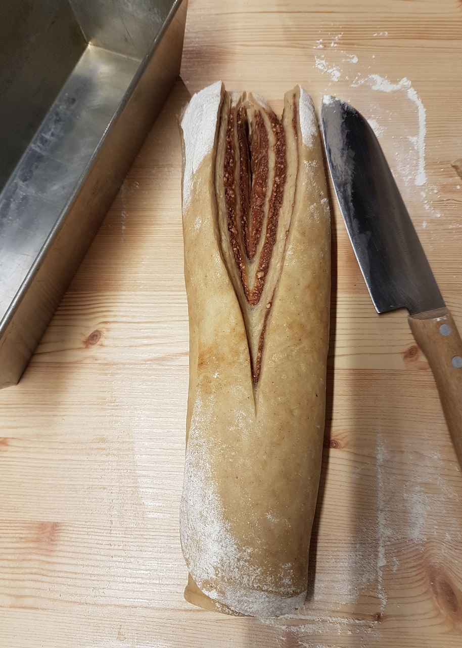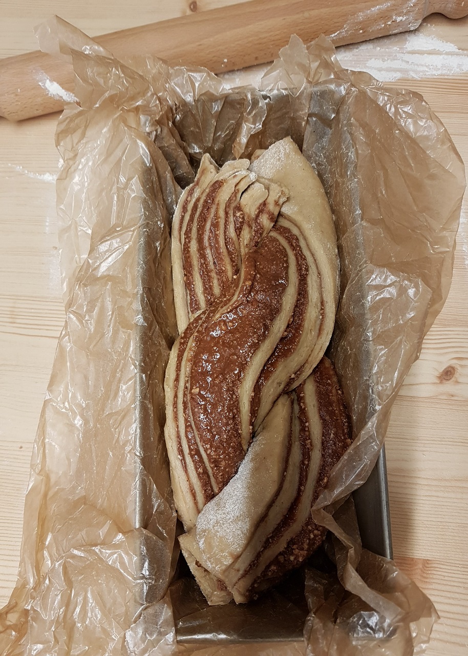 - Trancher la bûche en deux sur toute sa longueur et tresser les deux parties, puis déposer la pâte dans un moule à cake tapissé d’un papier cuisson. Couvrir et laisser gonfler 1h30 (four à 35°C).