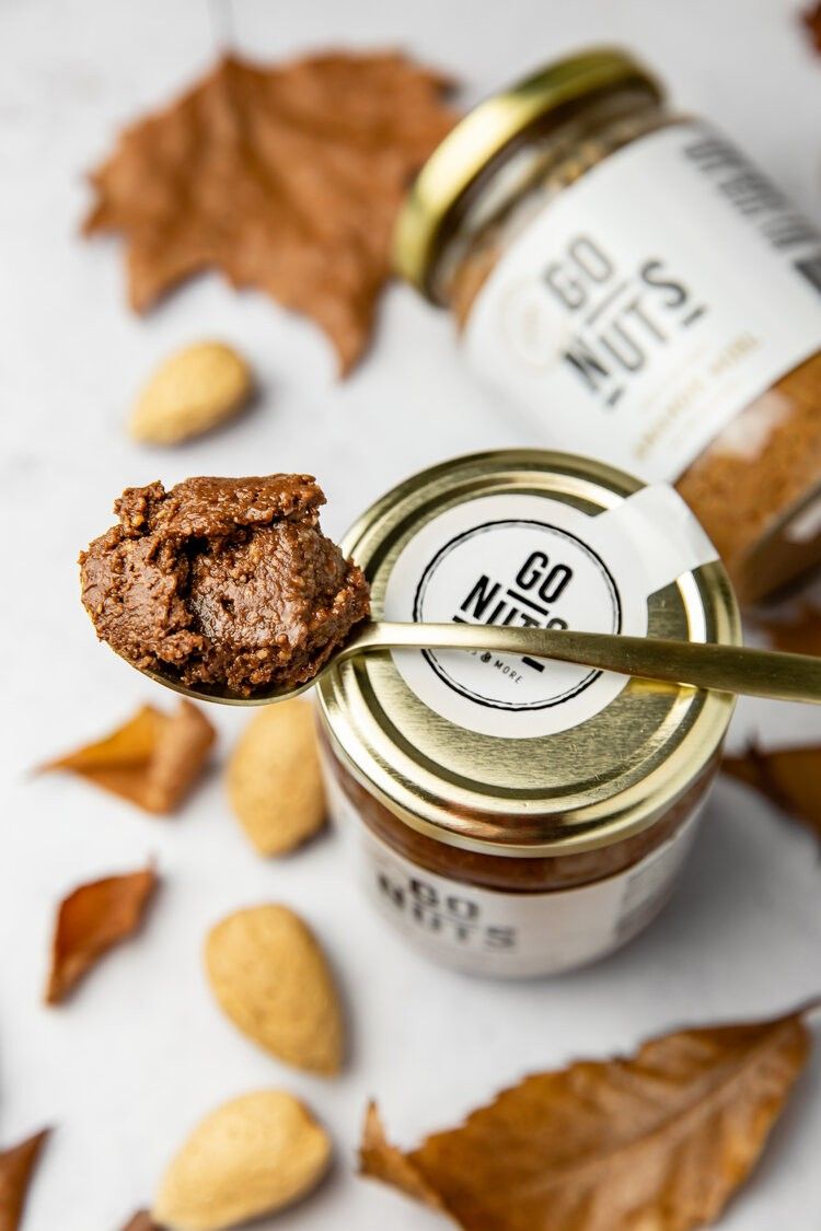 Dans cette recette, j’ai choisi d’utiliser la pâte à tartiner choco-noisettes Gonuts à cause de sa composition : 79,2% de noisettes toastées et le reste de pépites de chocolat noir 60% de cacao, ce qui la rend très peu sucrée (10 g de sucre pour 100 g de pâte à tartiner, incroyable !).