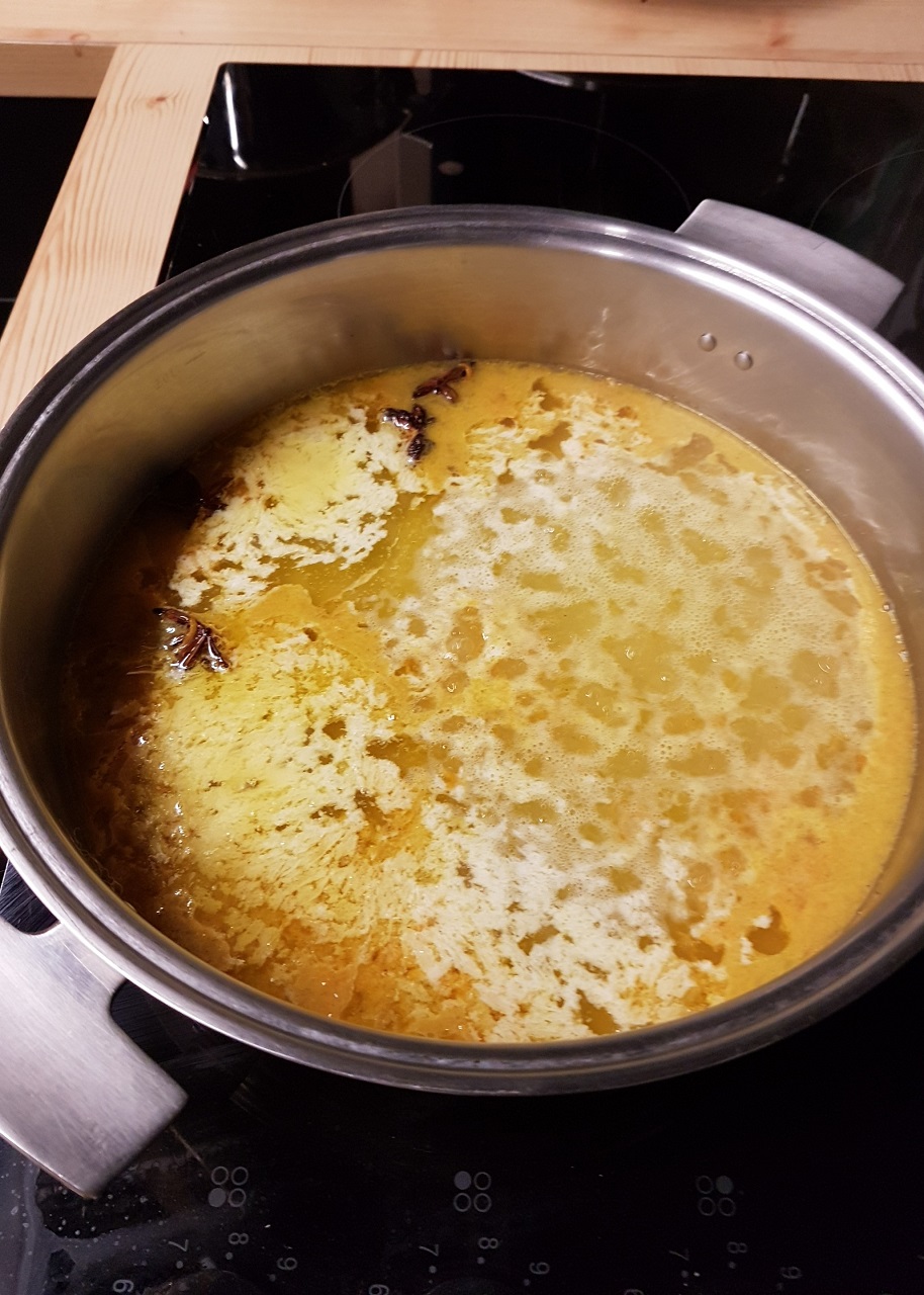 - Presser les oranges et récupérer le zeste de deux d’entre elles dans un récipient, y ajouter la cardamome et les étoiles de badiane.