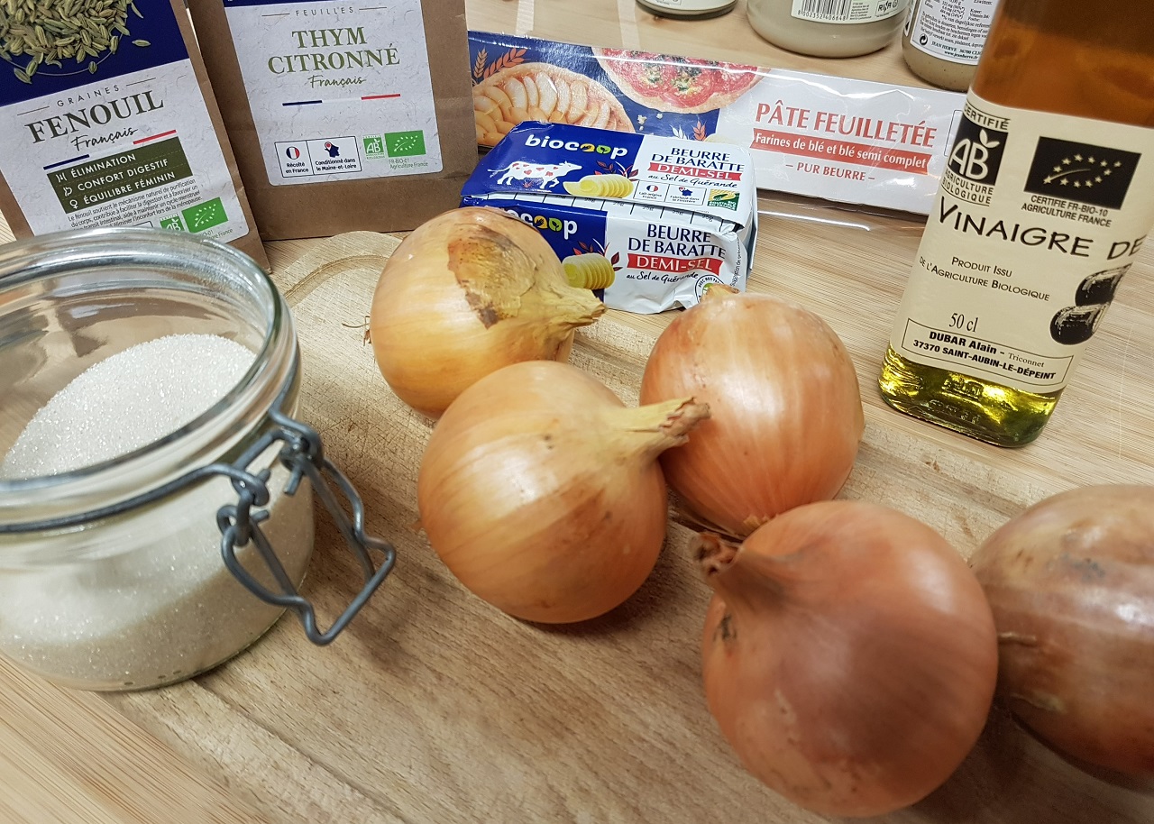 J’ai choisi d’utiliser la pâte feuilletée bio pur beurre de la marque Biocoop car je voulais que mon fond de tarte soit à la fois croustillant et fondant, et qu’il absorbe le jus caramélisé des oignons.