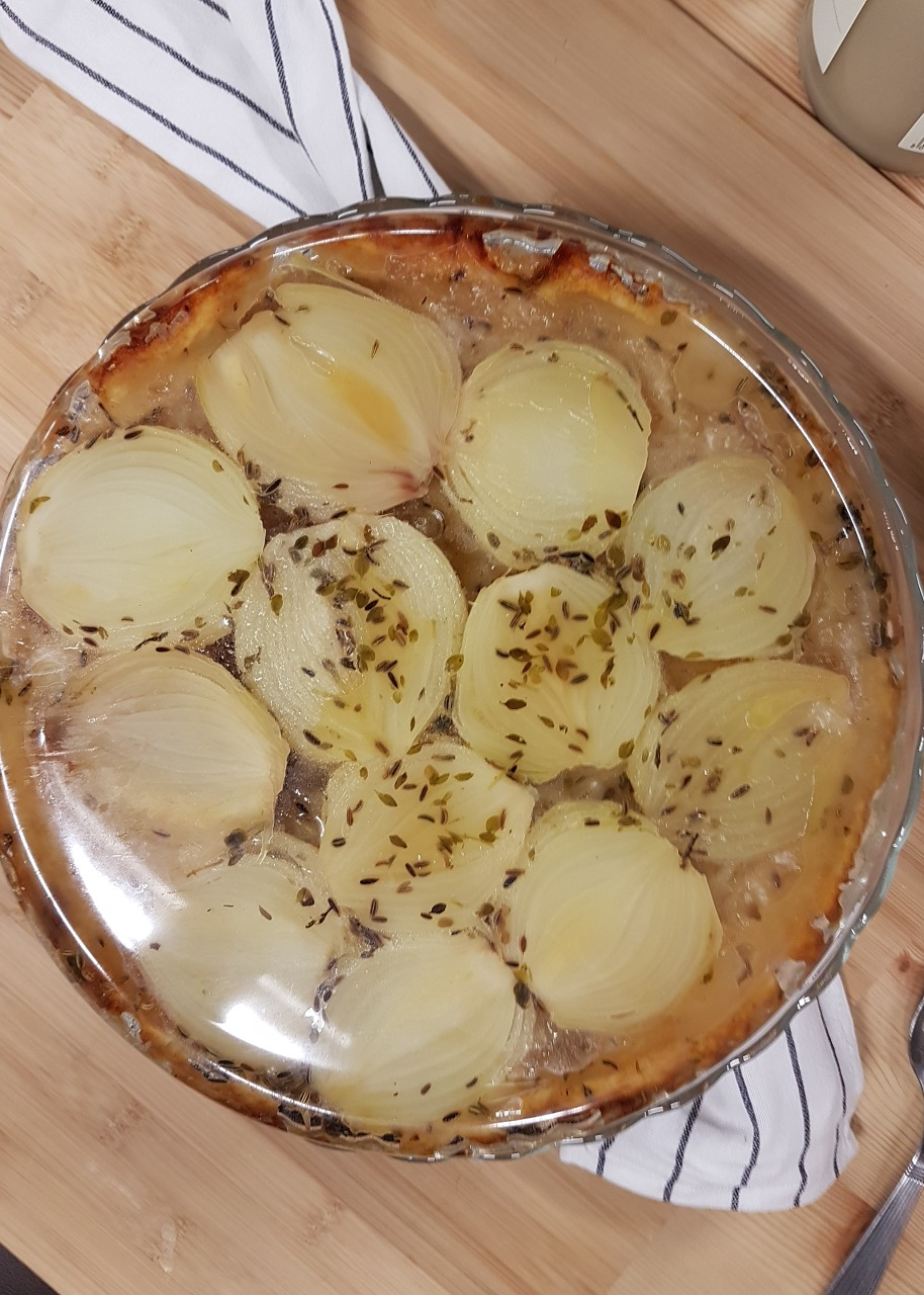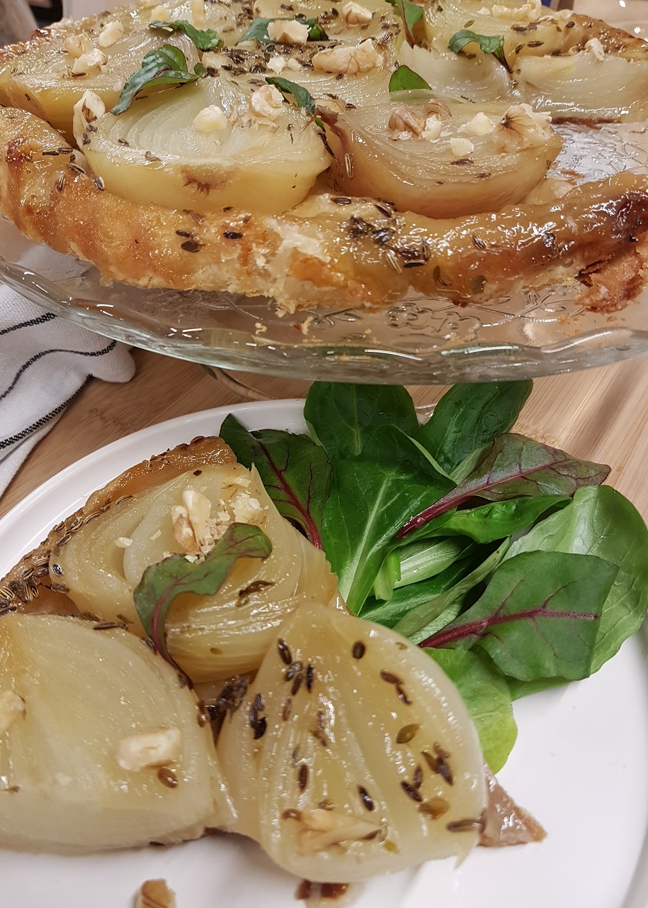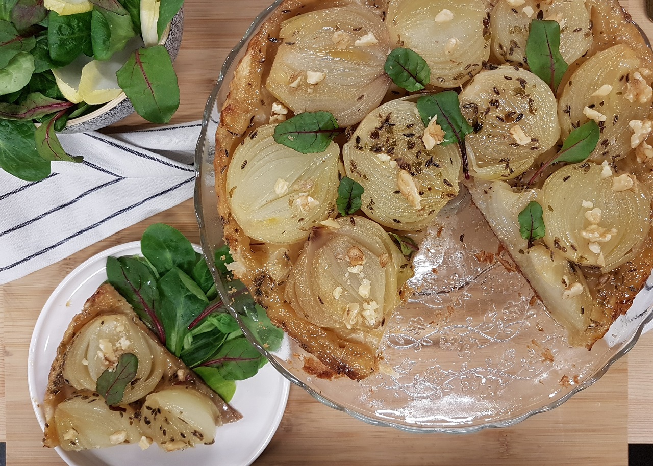 Tarte tatin d'oignons caramélisés aux graines de fenouil et au thym