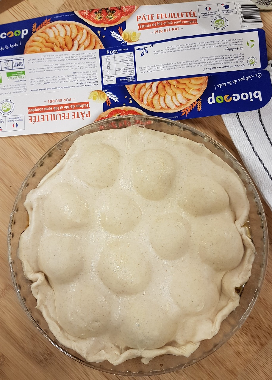 Pour les personnes qui ne consomment ni gluten ni lait, je vous recommande la pâte feuilletée végétale de Biobleud, que j’utilise assez régulièrement lorsque je préparer des tartes.