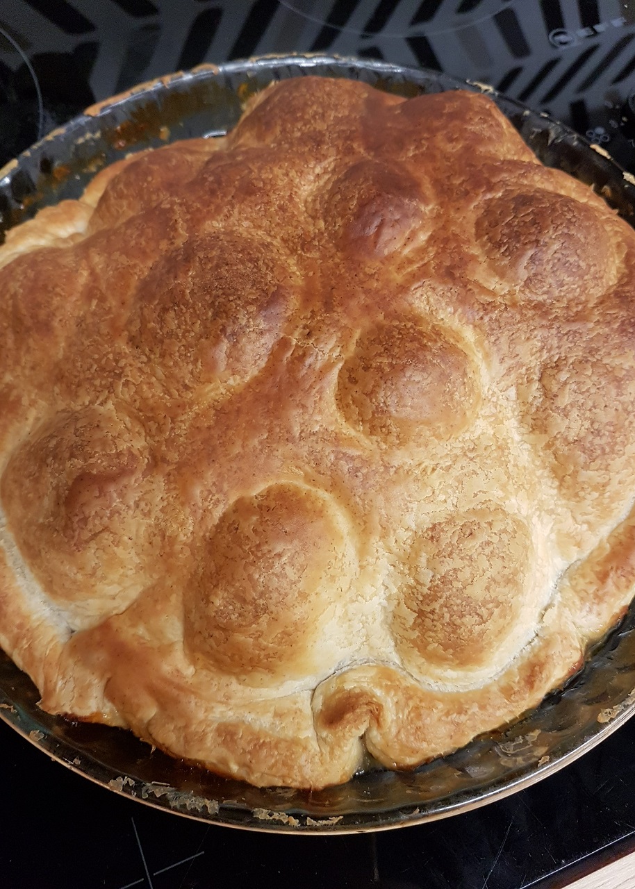 - Dérouler la pâte feuilletée et la déposer sur les oignons en glissant le bord de la pâte entre l’intérieur du moule et les oignons.
