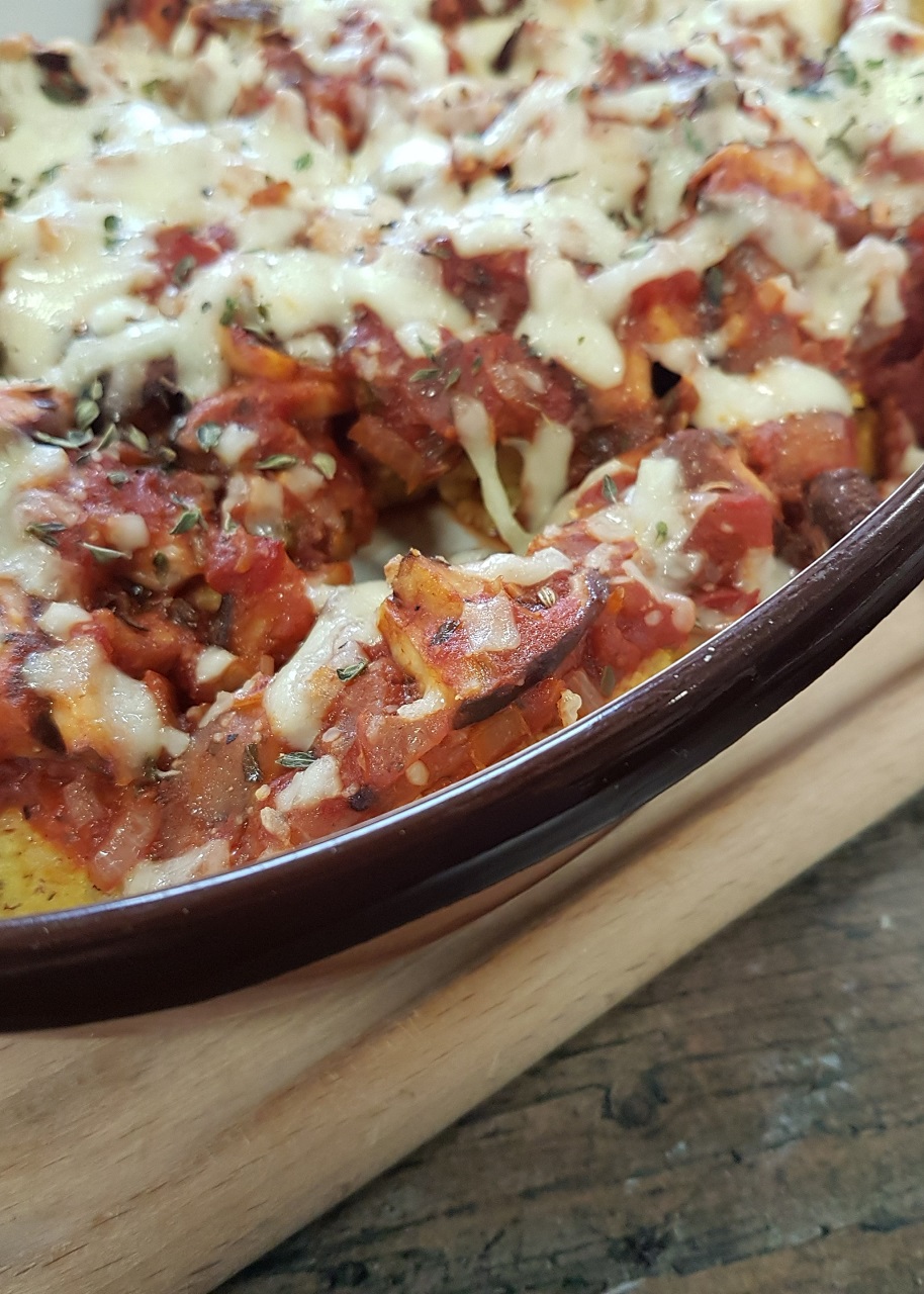 Quenelles de semoule de maïs gratinées à tomate, aux champignons et à la mozzarella