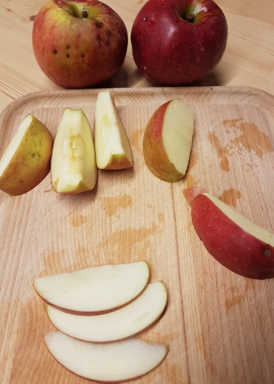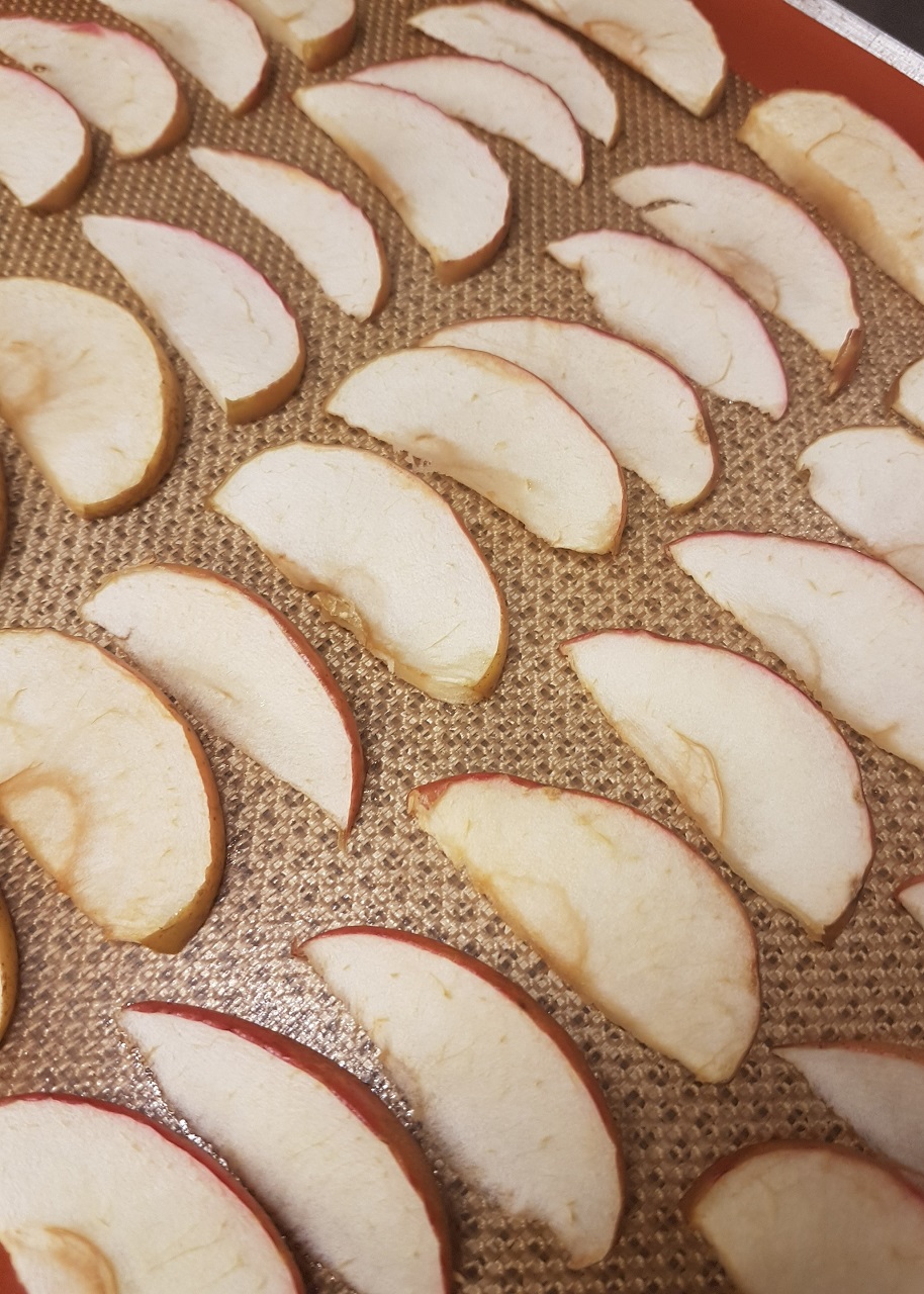 - Laver les pommes et les couper en lamelles sans les éplucher, puis les disposer sur une plaque recouverte d’un papier cuisson.