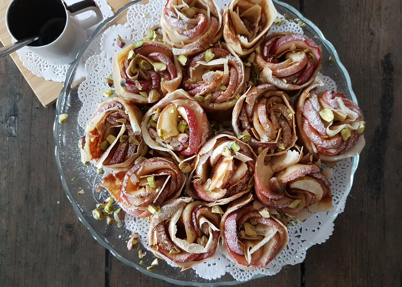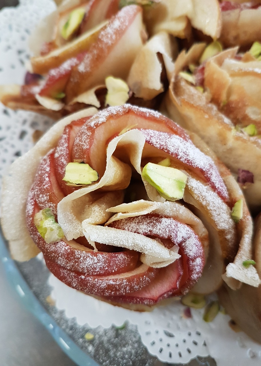 - Au moment de la dégustation, réchauffer au four 10 minutes, puis déposer les roses sur un plat en formant un bouquet et saupoudrer de sucre glace et d’éclats de pistaches.