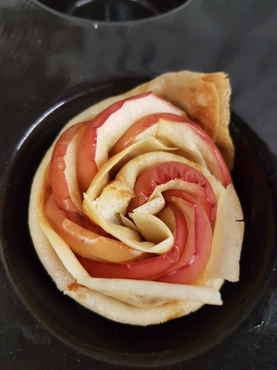 - Enrouler la crêpe garnie sur elle-même pour obtenir une rose qu’il suffit de glisser dans l’empreinte d’un moule à muffins. Répéter l’opération avec toutes les crêpes.