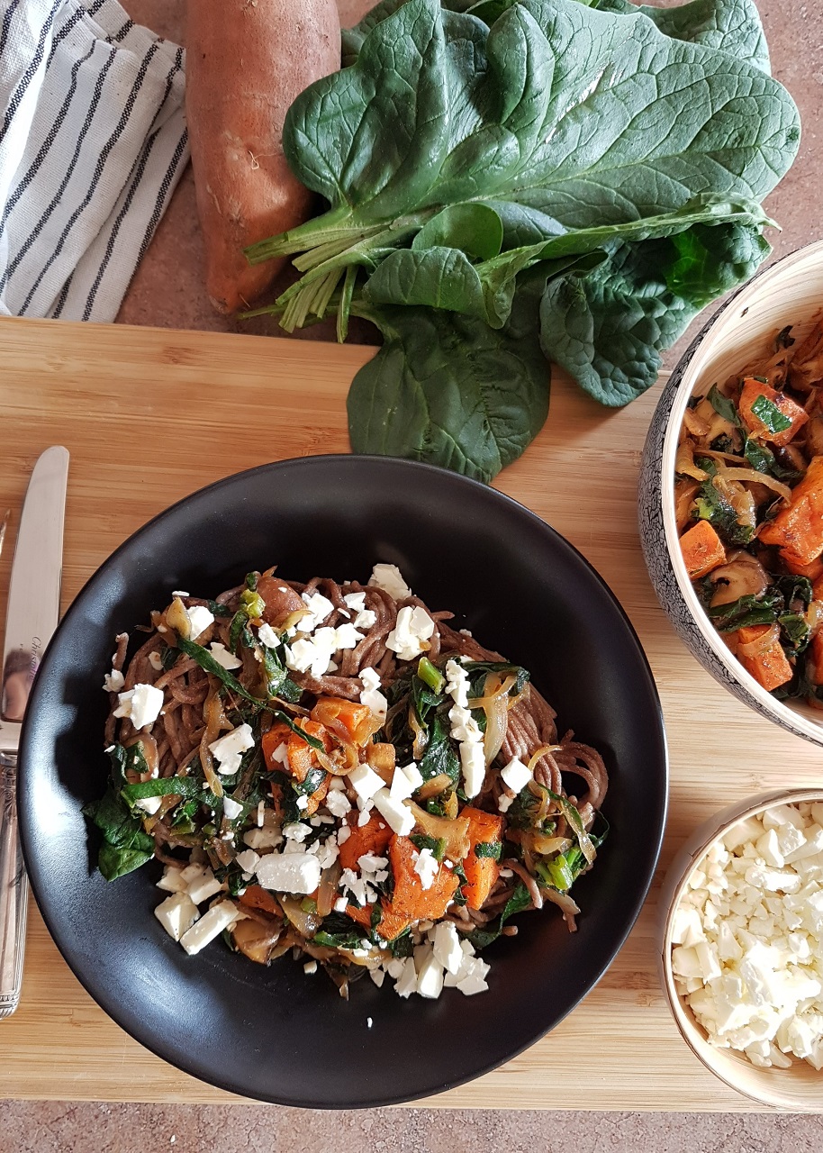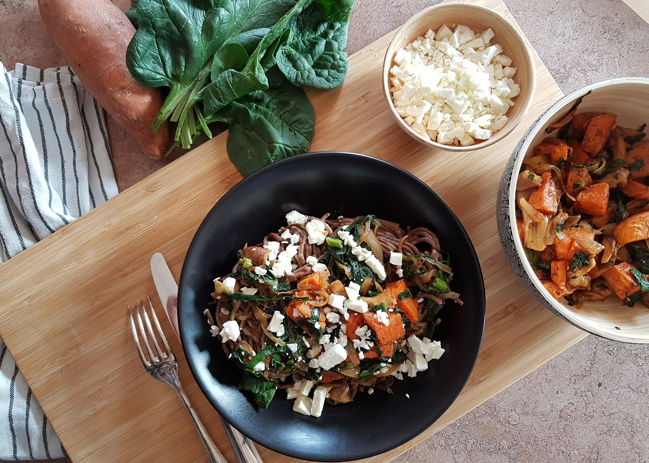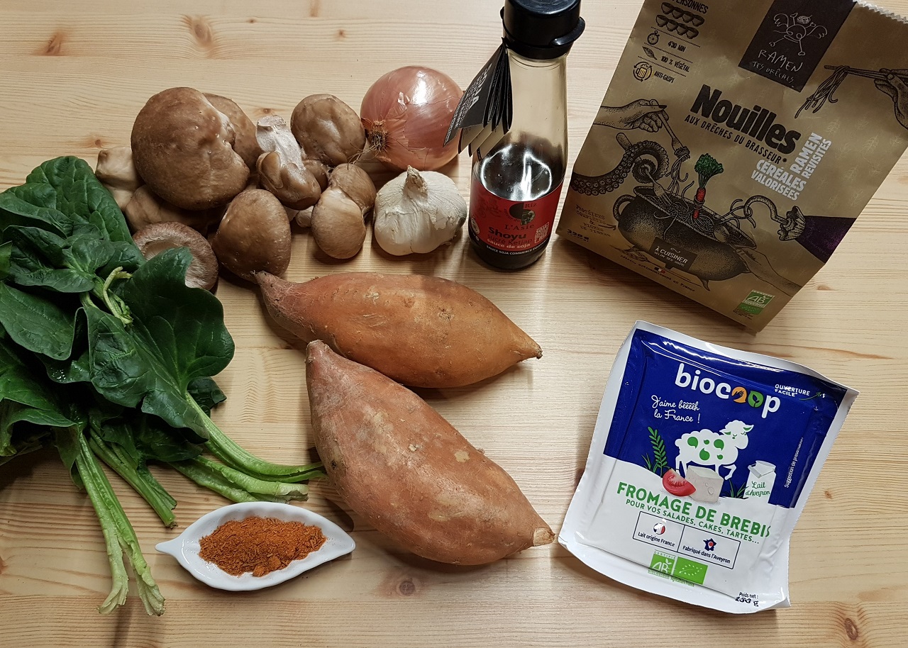 Je vous propose donc une recette rustique que je recommande aux sportif·ve·s (la veille d’une compétition) ou aux adolescent·es car son index glycémique est bas grâce aux nouilles à l’orge malté et aux légumes que j’ai choisis en accompagnement : champignons shiitakés, épinards et patate douce.