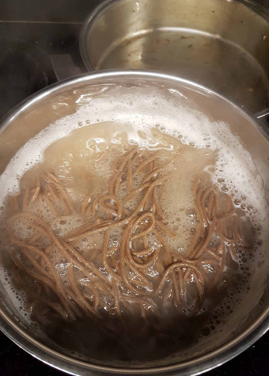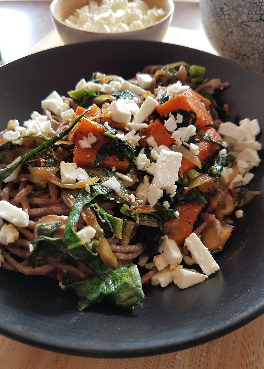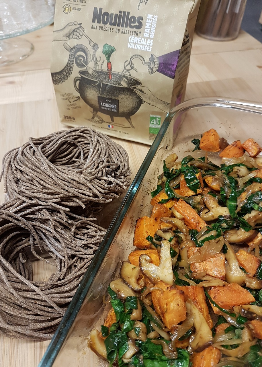 Nouilles de drêches anti-gaspi aux légumes et au fromage de brebis