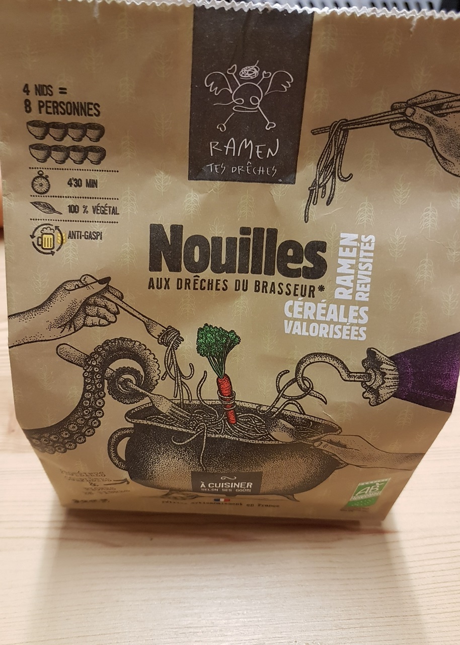 Au détour des rayons, je suis tombée sur un nouveau produit qui m’a interpellée : des nouilles de drêches de brasserie, les résidus de production de la bière (de l’orge malté qui ne sert plus à rien une fois la bière brassée).