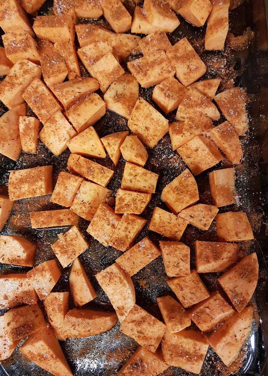 - Éplucher la patate douce, la couper en gros cubes, les enrober d’huile d’olive et les saupoudrer du mélange d’épices pour grillades, puis les disposer dans un plat allant au four et les cuire 25 minutes à 180°C.