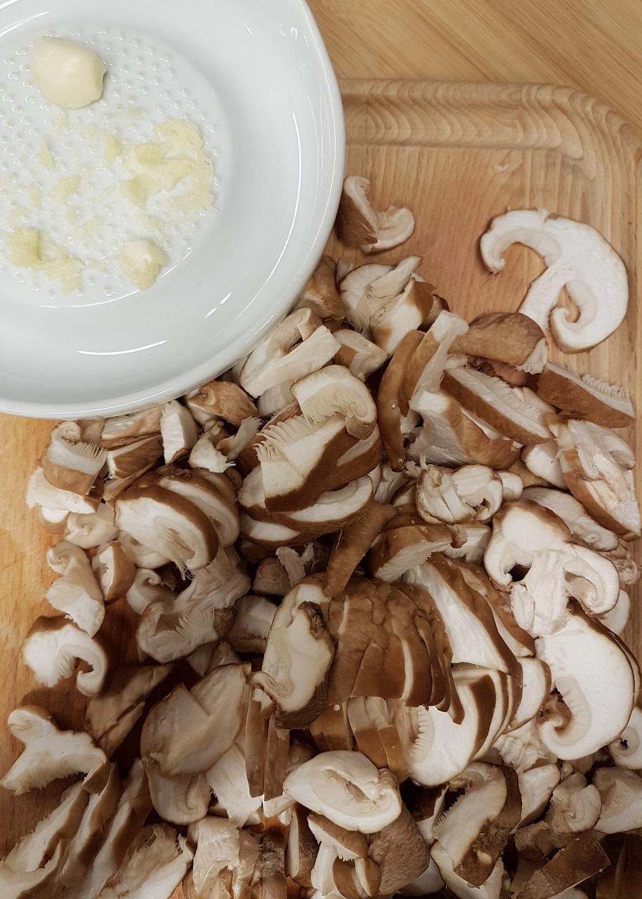 - Laver les épinards et les couper en lanières, laver les shiitakés et les émincer, éplucher l’oignon et l’émincer. Réserver tous les légumes.