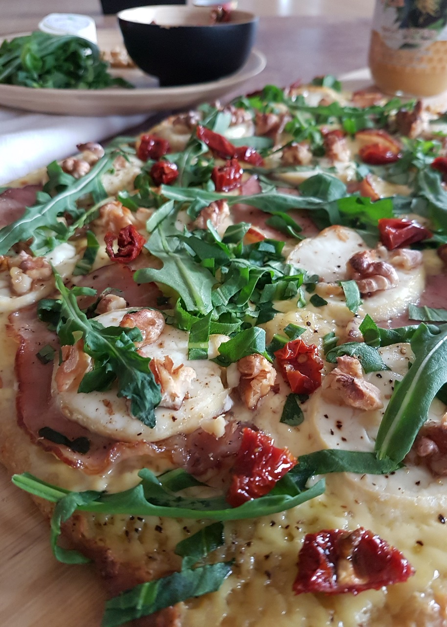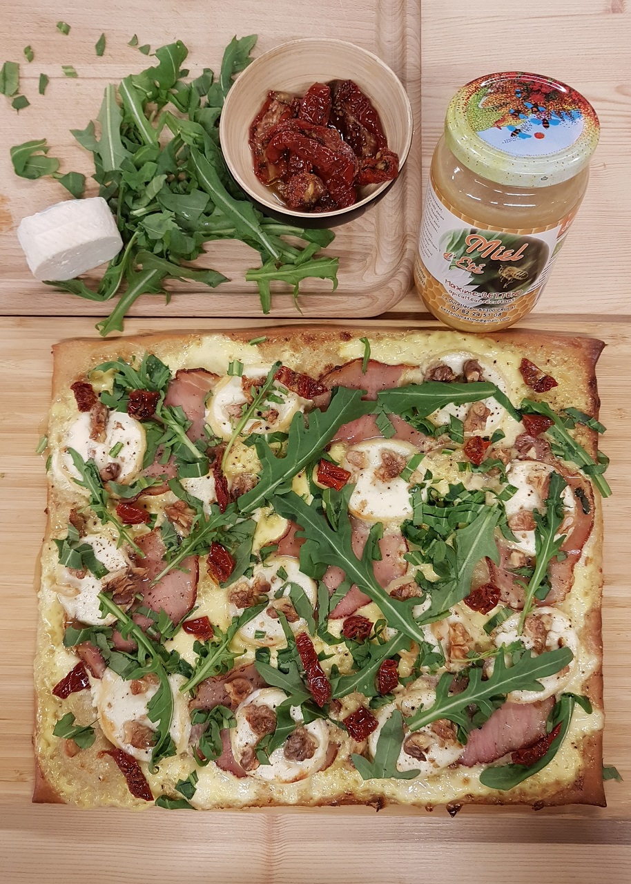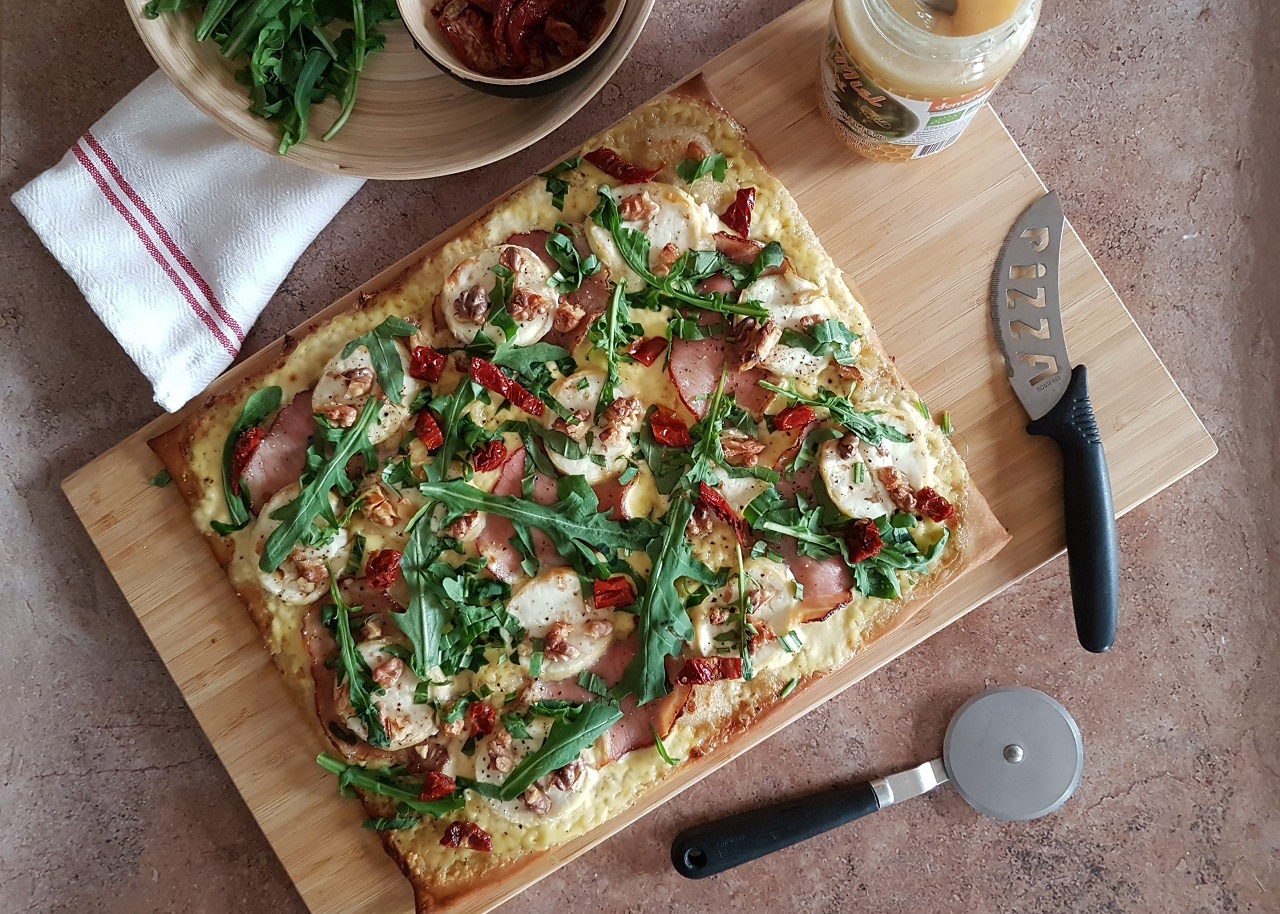 Pizza printanière au chèvre, au miel, aux noix et au bacon