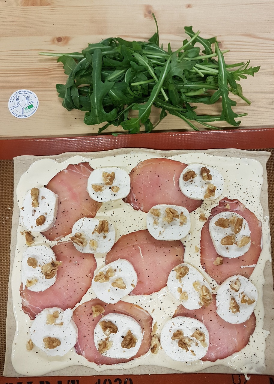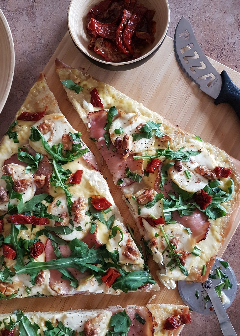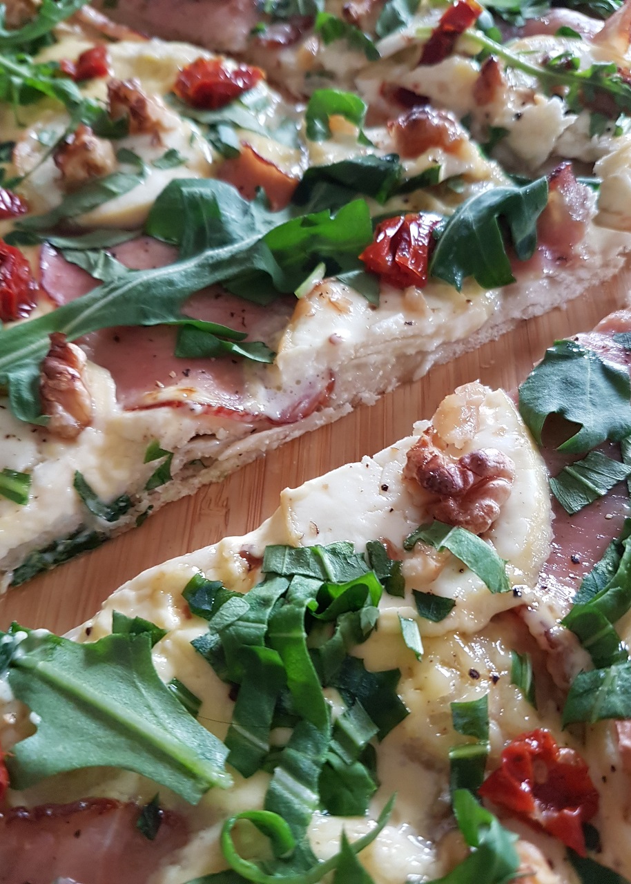 Pizza printanière au chèvre, au miel, aux noix et au bacon